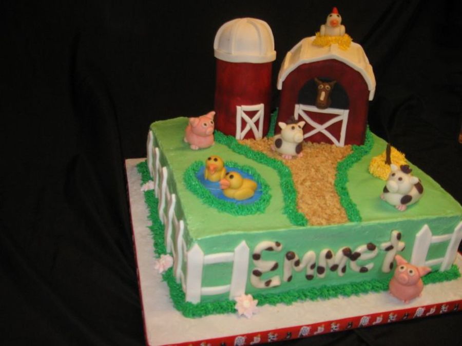 Farm cake for a 1 year old. SMBC icing, with fondant barn & Silo (made of rkt) and fondant animals. Lots of inspiration from others on CC - thanks!