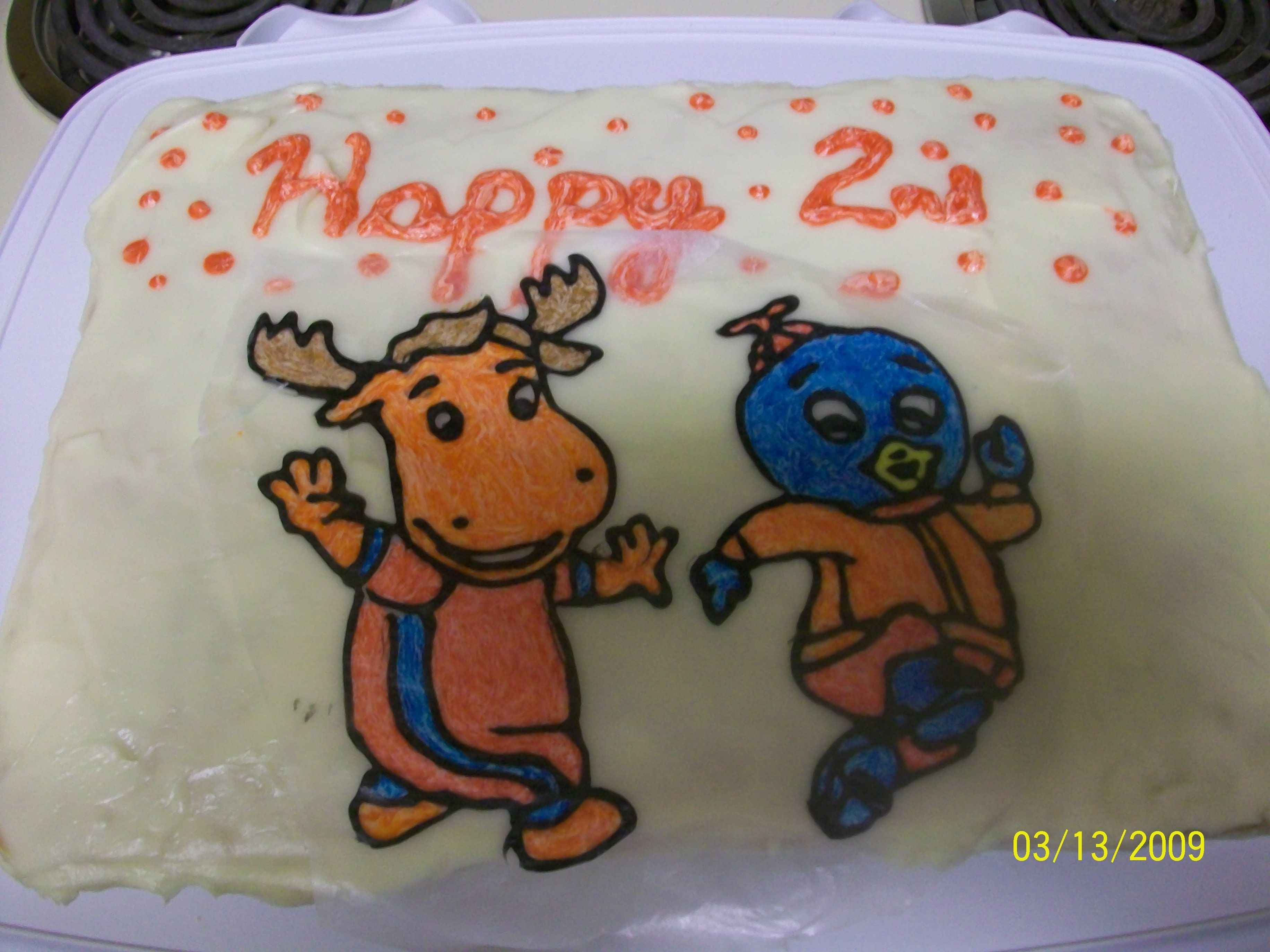 I used a buttercream transfer. Unfortunately the outlining would not come off the wax paper and the rest of the characters did, but not properly. These pics were taken with the wax paper attached! I also had a hard time getting the frosting to color properly, the coloring seemed to only change parts of the frosting. Any suggestions/comments/tips would be appreciated.