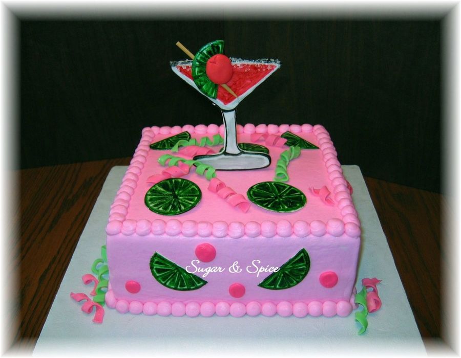 For a Bachelorette Party; 8" white almond cake decorated in buttercream with fondant limes, confetti and topper. Rim of glass has white sparkle sugar on it.