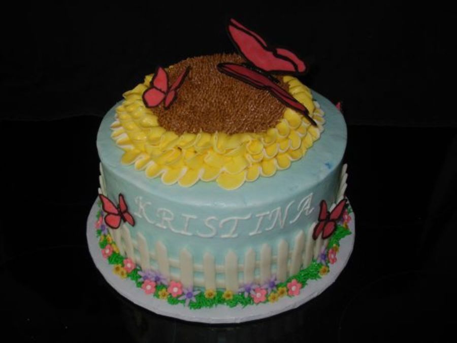 Fondant fence and plunger flowers, chocolate butterflies.