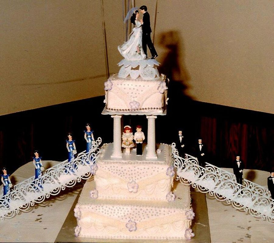 6-8-12" Square wedding cake. My first cake, done for my best friends. All buttercream decorations and royal icing drop flowers dusted with lilac lusterdust. Strings of Pears for boarders.
