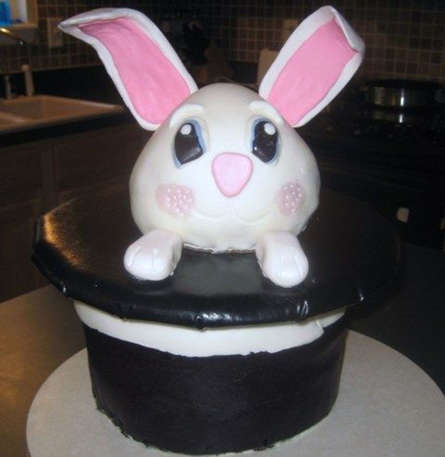 Thanks to all the wonderful ladies here for the inspiration for this one. I had major trouble with the black fondant. It just got too soft after adding all the black coloring. This was my 5th cake I think. Also, I had to get creative with the brim as the cake had to travel 2 hours in a car, would not be eaten for two days. So the hat was in one cake box and the rabbit head was in another and the customer assembled it themselves. Fun and easy cake to make. I just need my skills to improve!