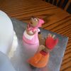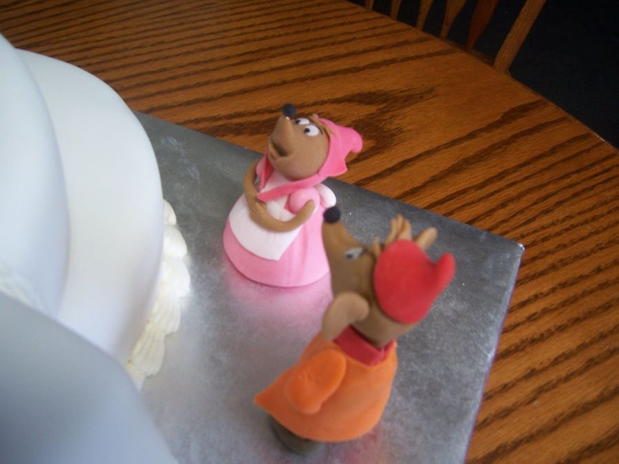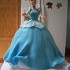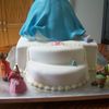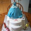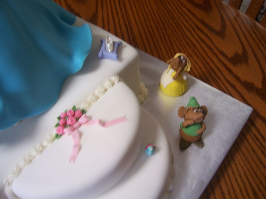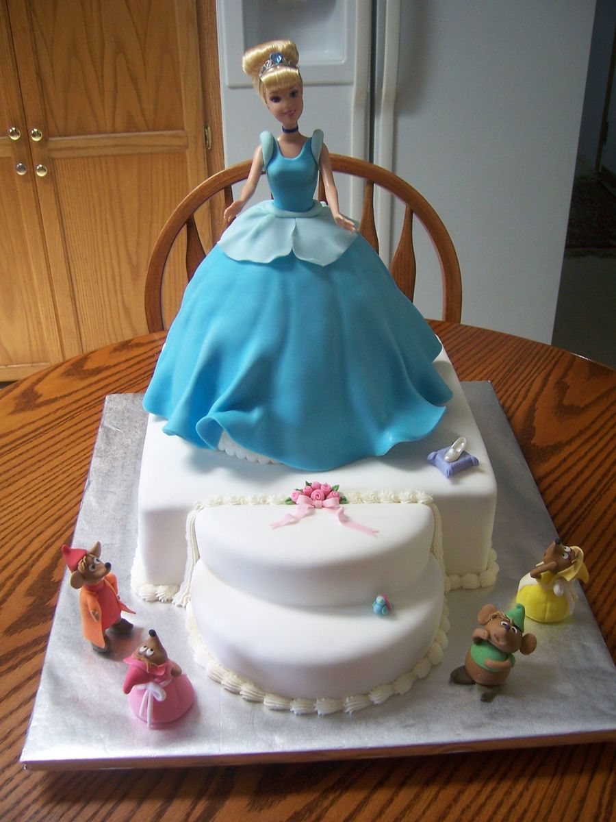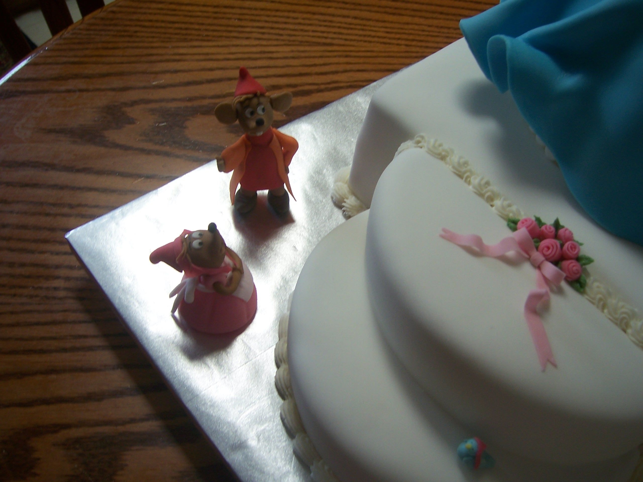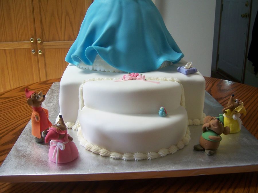 Cinderella is Chocolate Swiss pound cake, the square cake and stairs is vanilla confetti cake, all cakes iced in butter cream icing and covered in fondant icing, the mice, and all details are done in fondant icing.