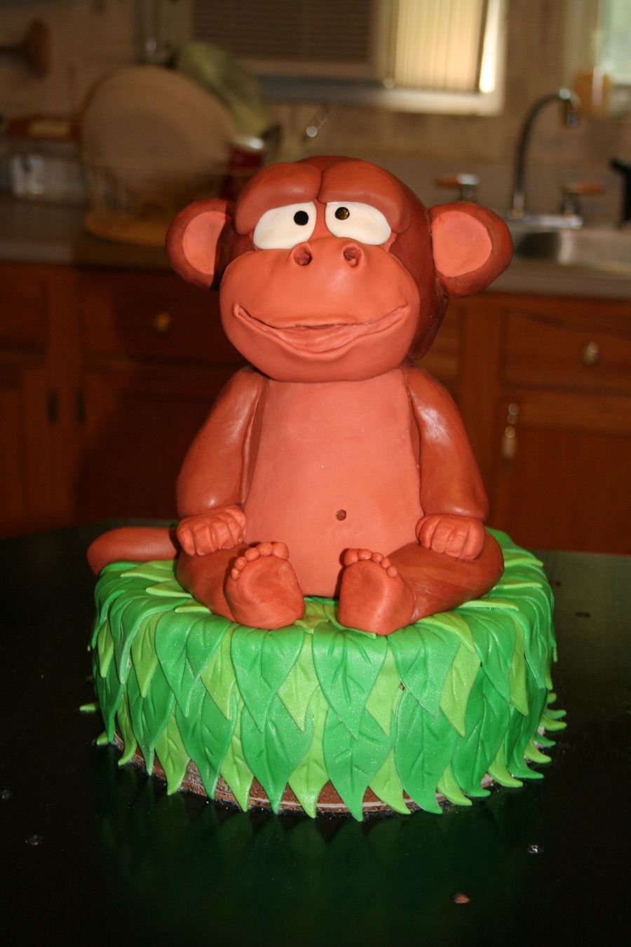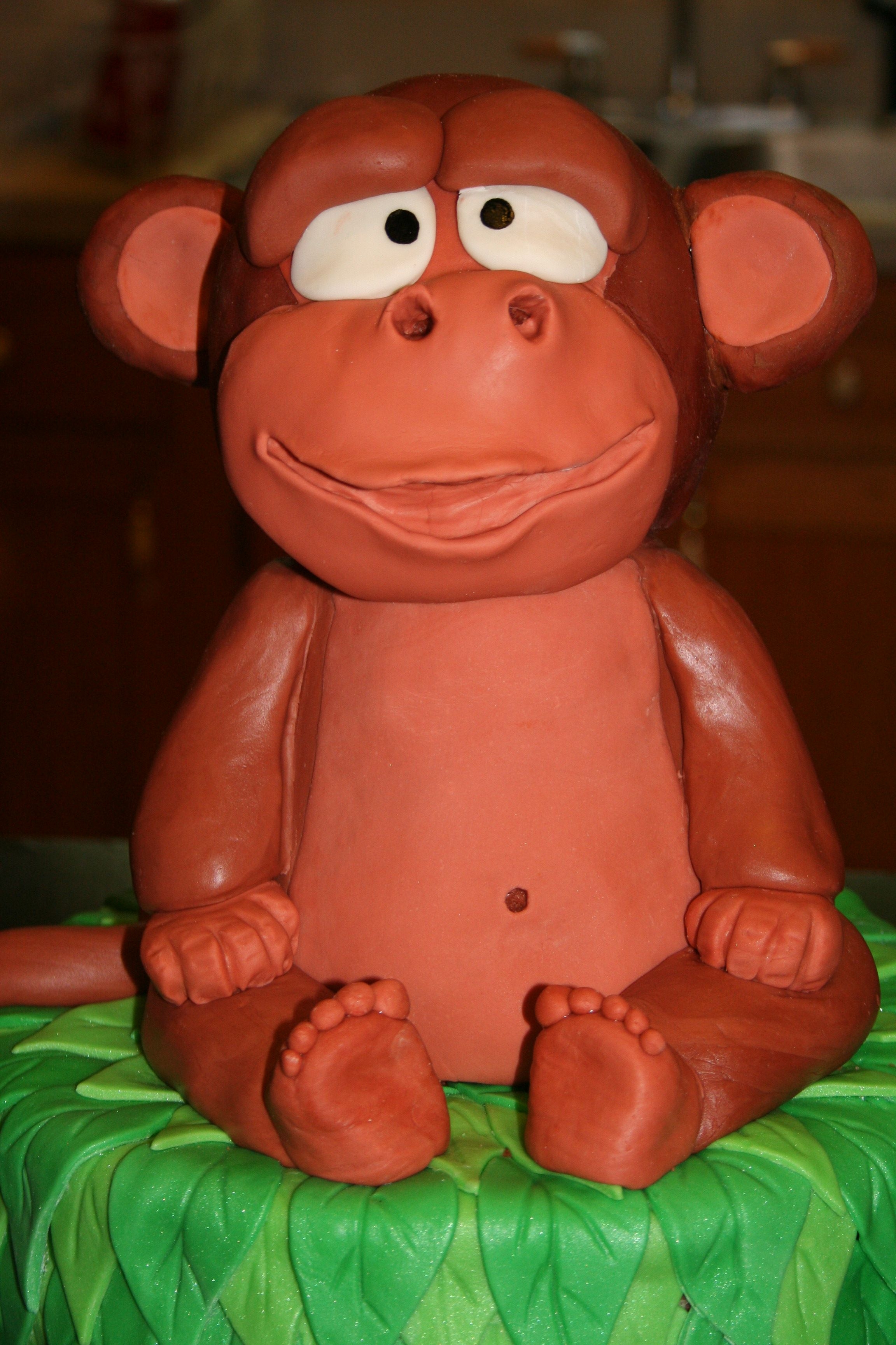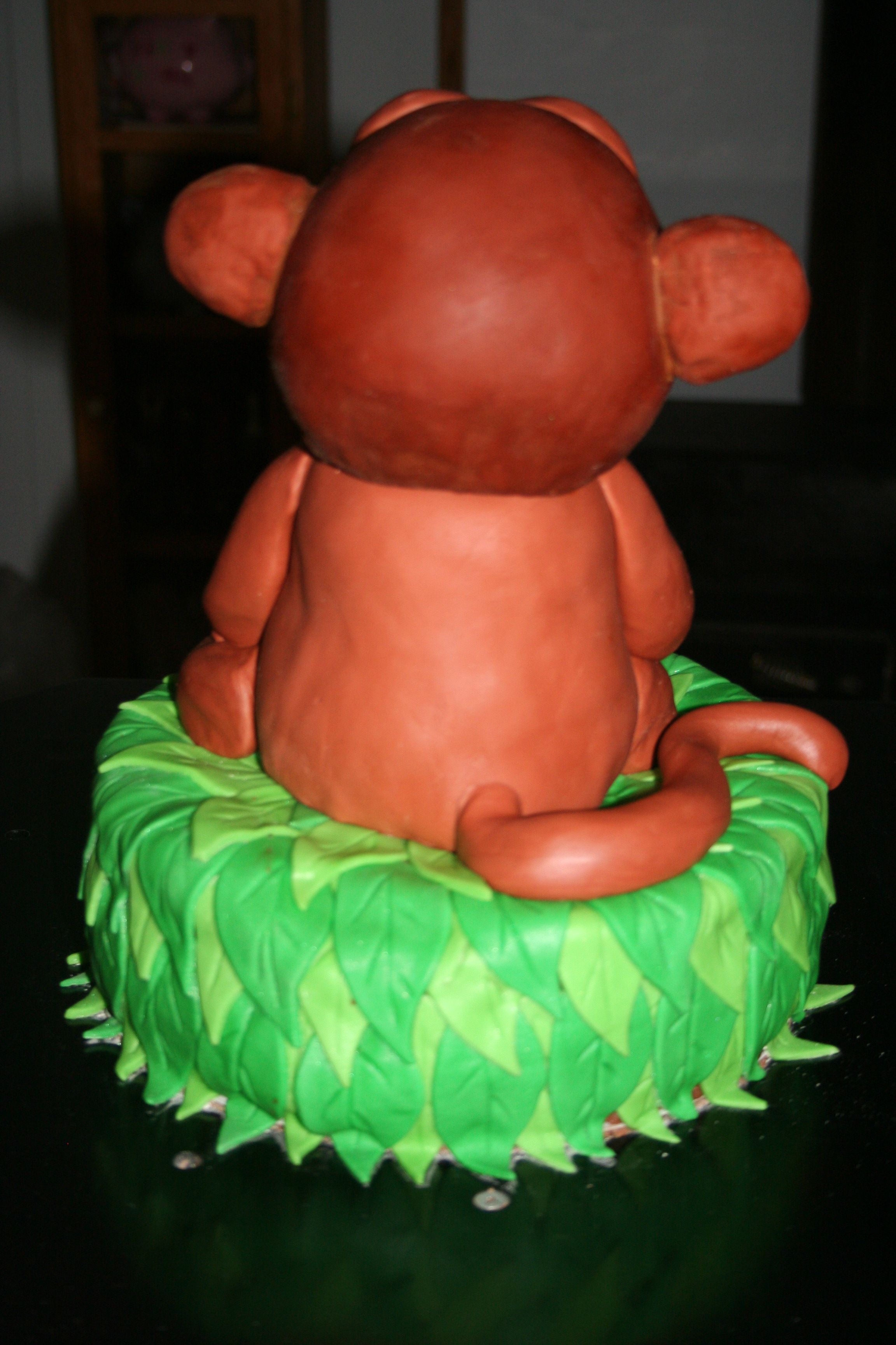 Monkey is rice krispie treats covered fondant. Cake is yellow, covered in chocolate bc with green fondant leaves on top