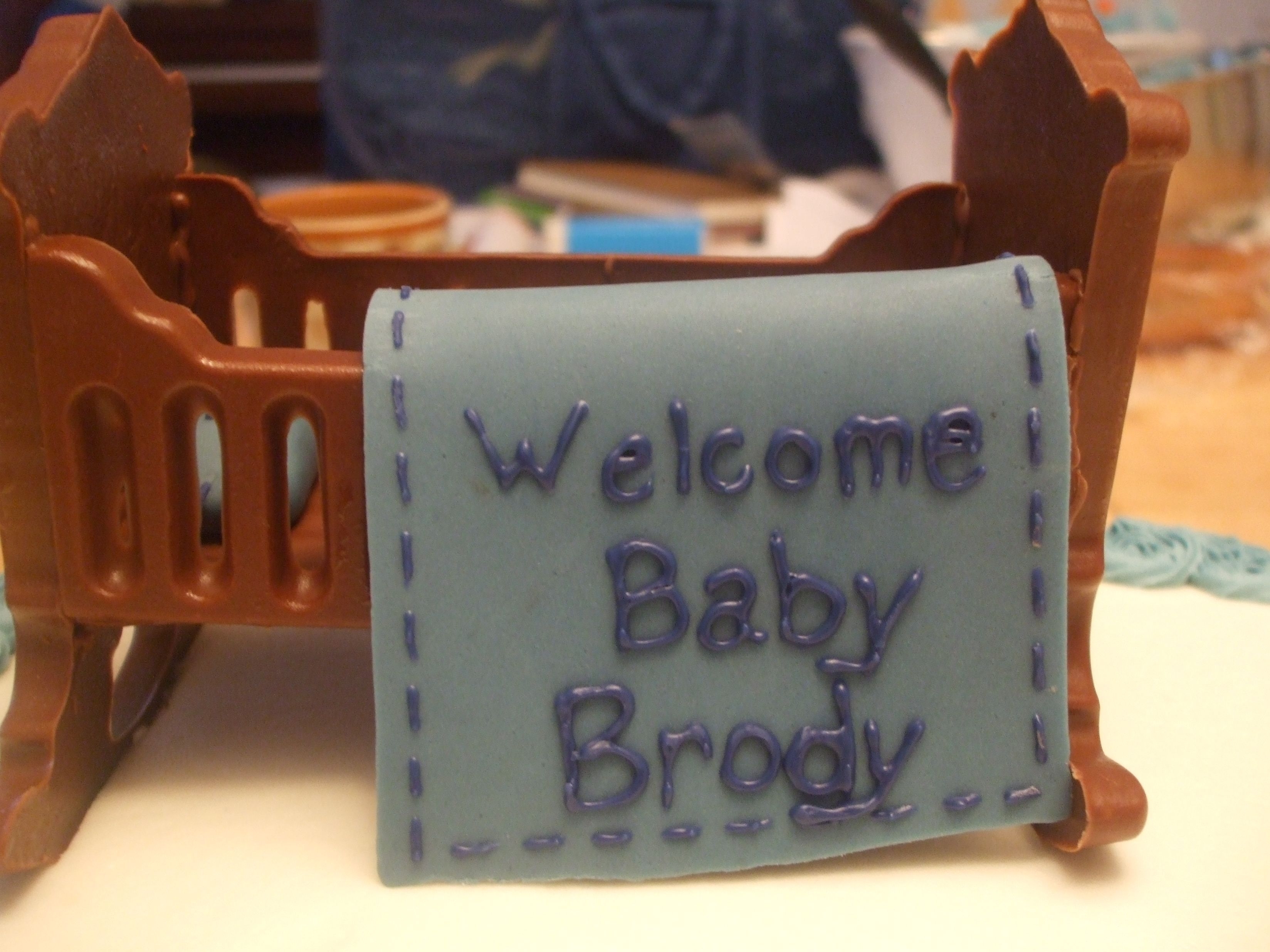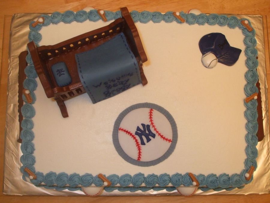 Got a request for a baby shower incorporating New York Yankees. Chocolate cake with cookies-n-creme buttercream filling. Fondant "blanket" and "rug"; chocolate accent pieces on side.