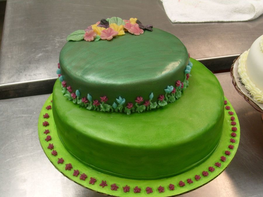 Pound cake with fondant painted with luster dust. Buttercream flowers