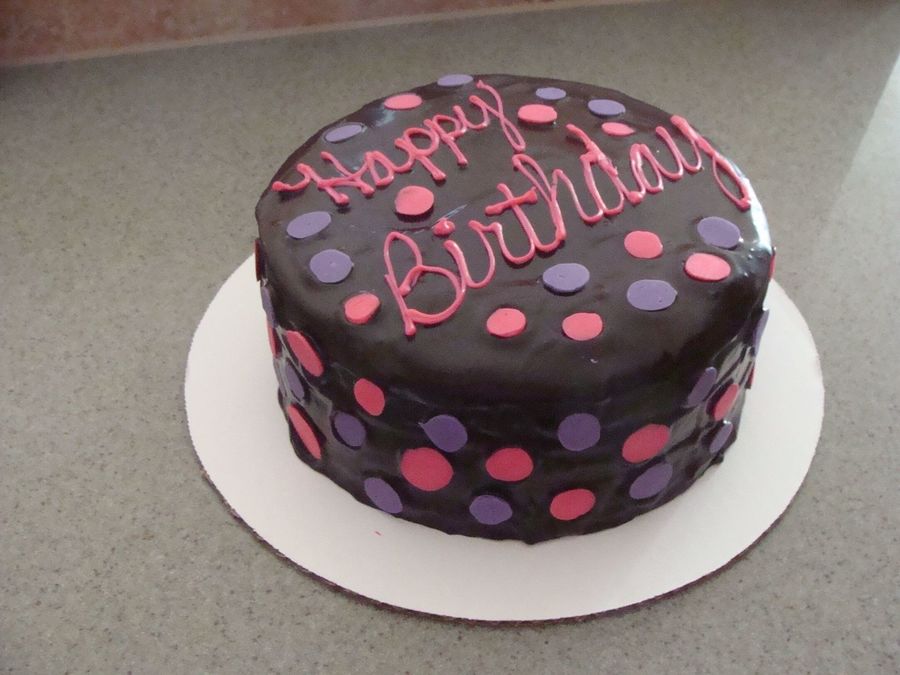 Birthday Cake for my BF! Chocolate cake, chocolate ganache filling and coating. Chocolate polka dots and wording.