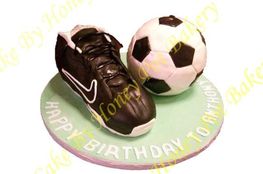 the shoes is half sheet cake diveded to 3 and carve to shoes shape cover with fondant, the lace is a Licorice lace, logo is made by fondant, ths soccer ball is Wilton Sports Ball Pan Set, using the template cut the pieces out and cover the cake piece by piece , use steamer to get the leather shinny look. The birthday boy is my 10year old son.