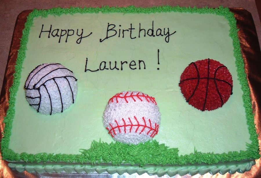 This cake was made for a co-workers 17 yo daughter who plays volleyball, basketball and softball. Milk chocolate cake and almond BC. Balls were made with mini-ball pan.