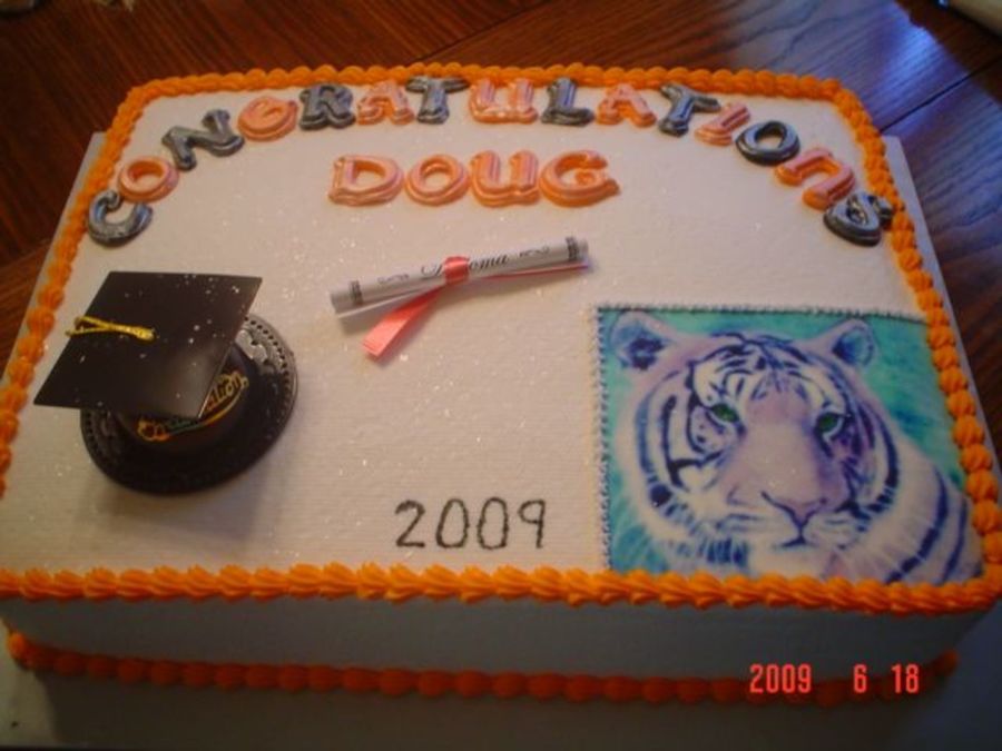 11x15 white cake frosted with BC. Used fondant and Wilton alphabet to make wording. Edible sheet tiger and a plastic graduation hat. Paper diploma Colors were orange and black. 2009 used an edible pen