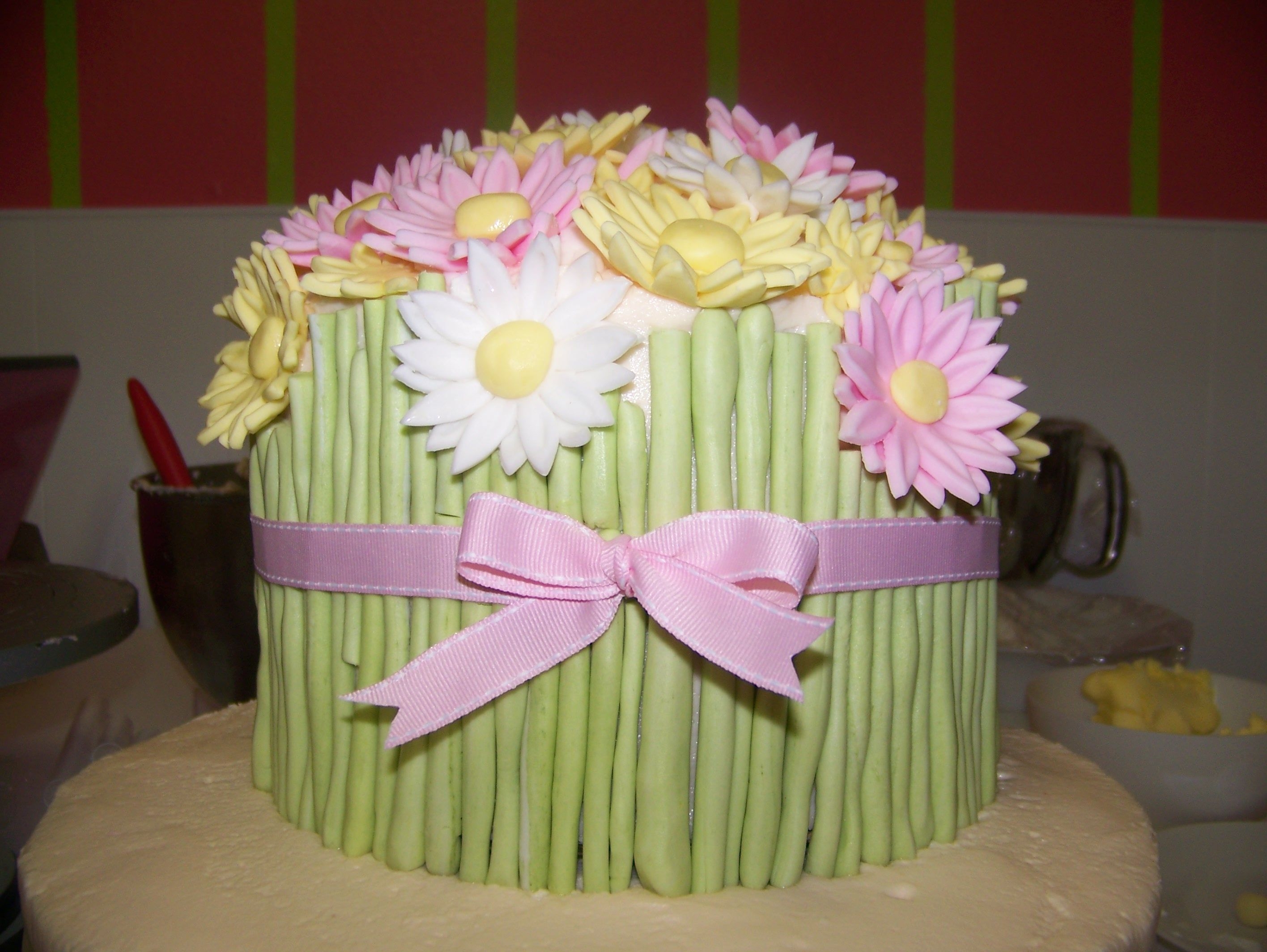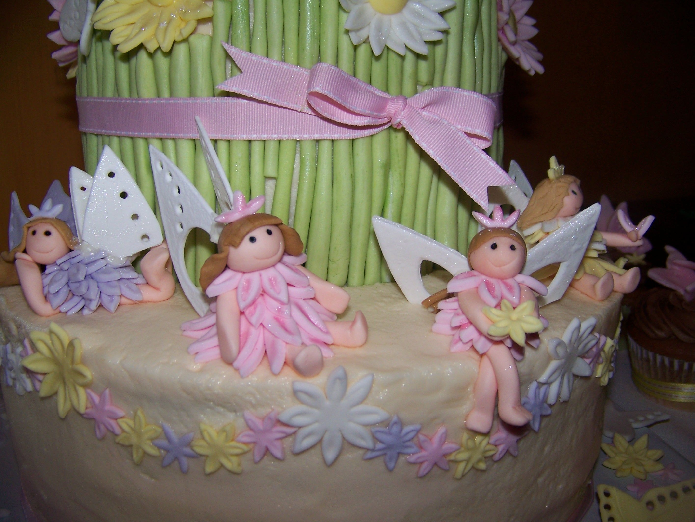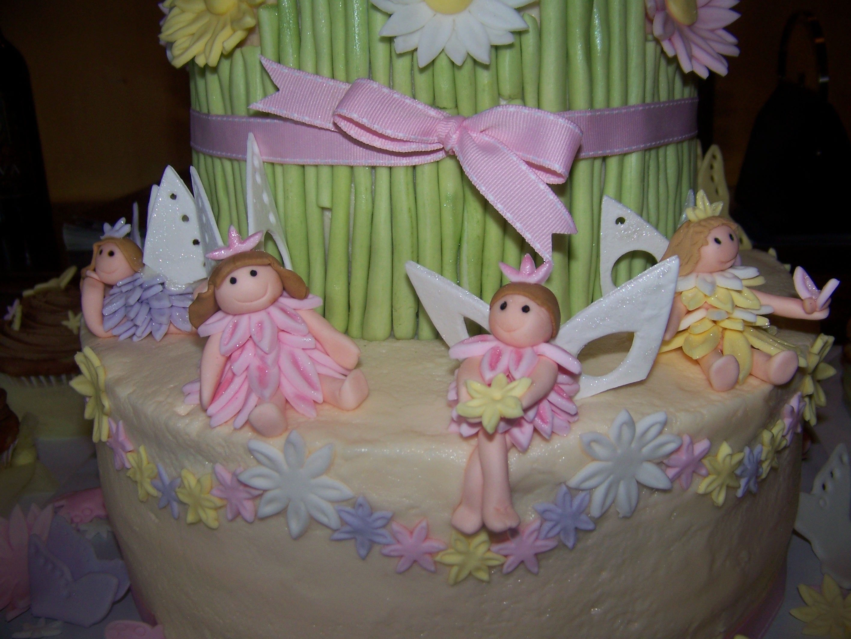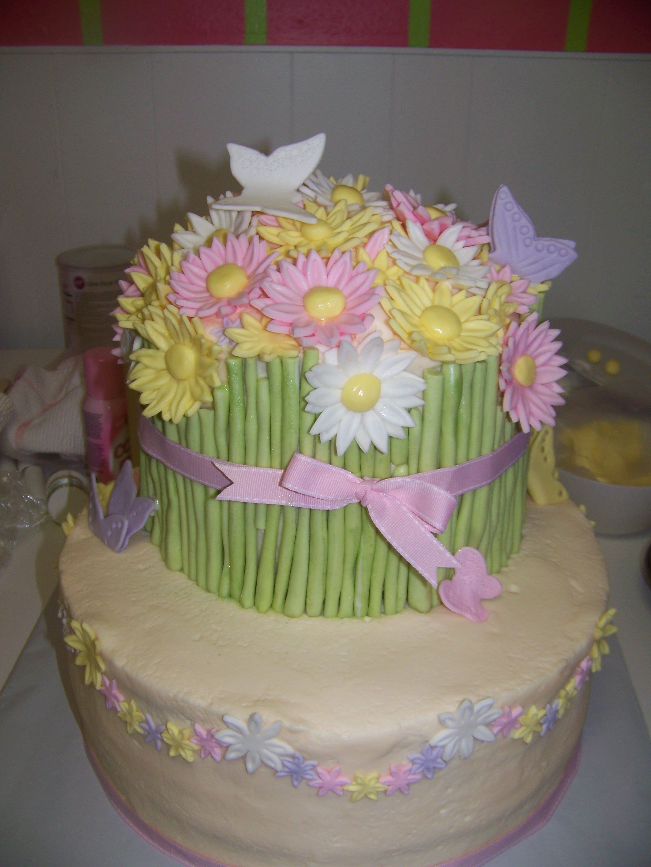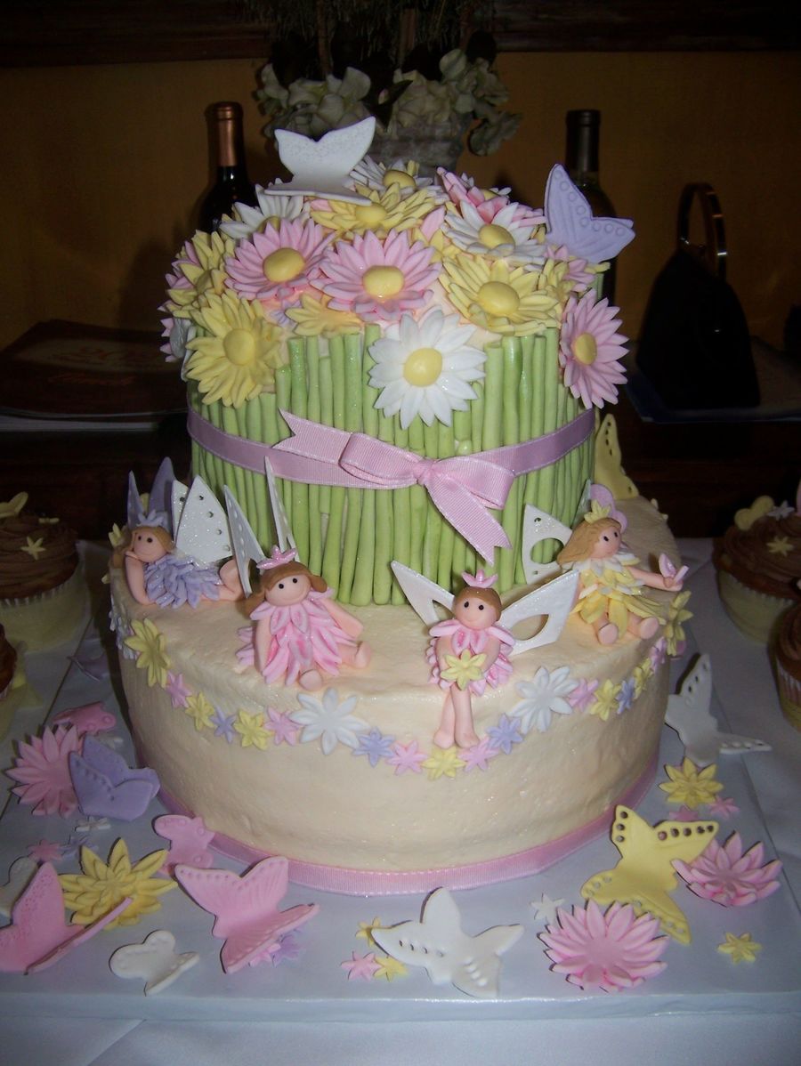 this was a carrot cake iced with decorators cream cheese iceing(recipe on CC) and it was soooo good!!! fairies flowers and butter flies were all fondant fairie wings are gumpaste. i was sooo happy to do a girlie cake! thanks for looking