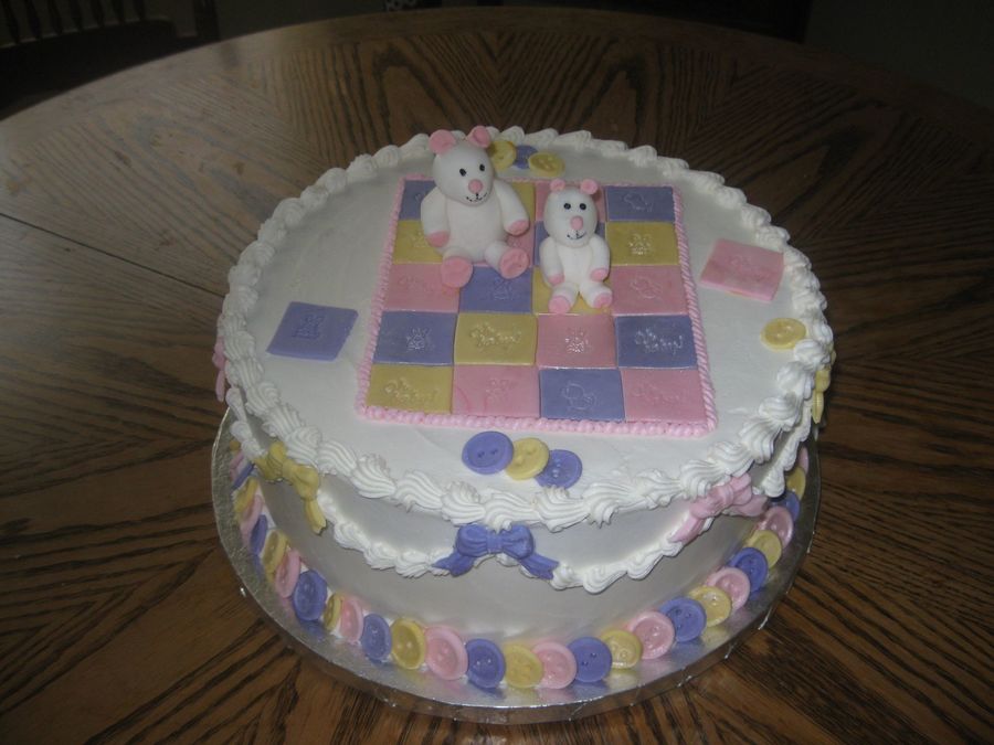 14" round white with raspberry mousse. Buttercream with fondant accents. Inspired by several cakes on CC thank you for you inspiration. Bears didn't come out as well as I hoped