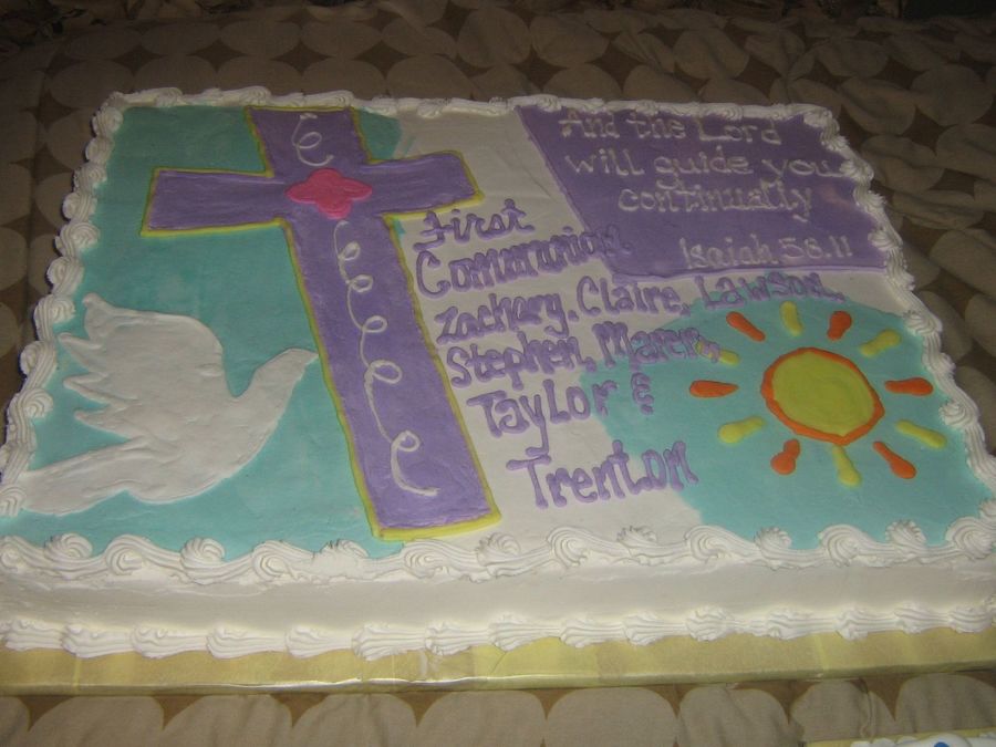 This is a First Communion cake designed to match the napkins and plates for the celebration. This is a full sheetcake. Thanks for looking.