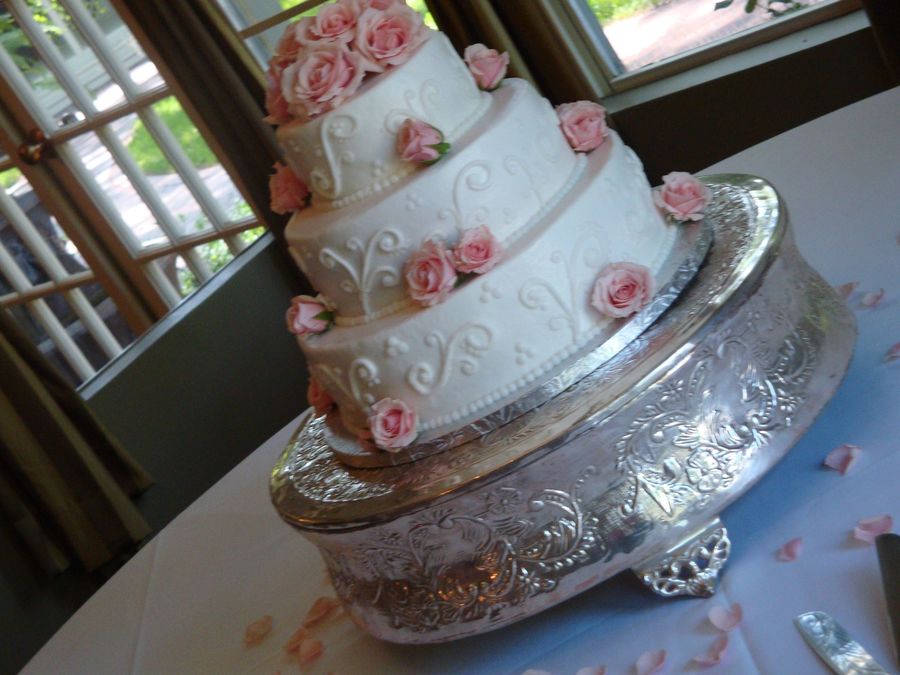 3 tier WASC, buttercream wedding cake with fresh flowers and hand piped buttercream scrolls, swirls and dots.