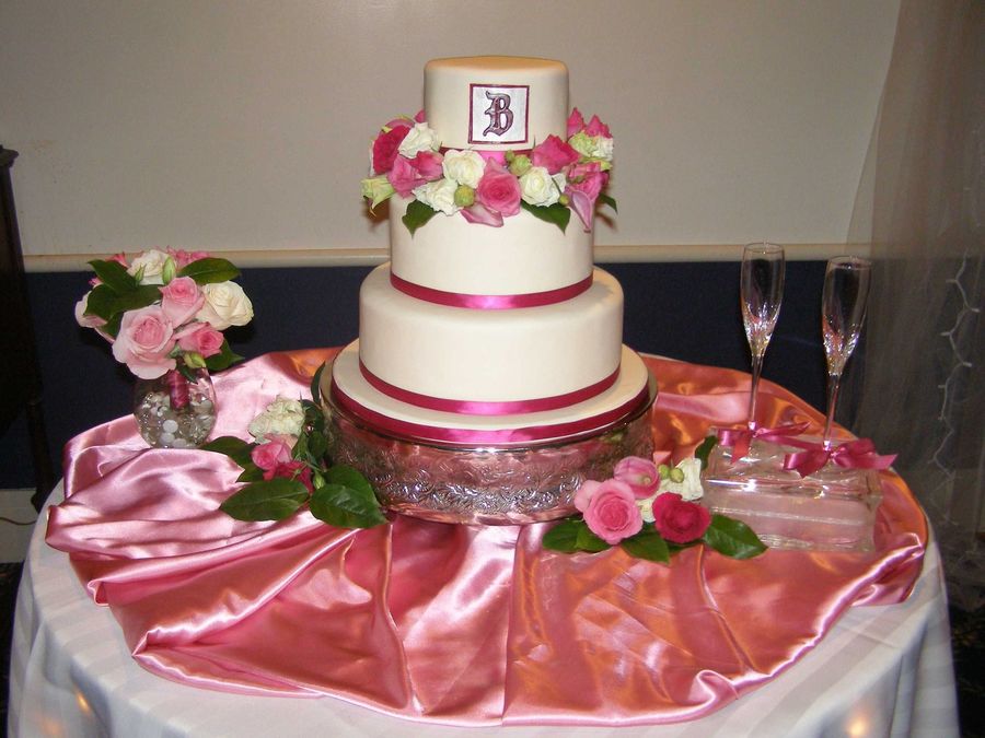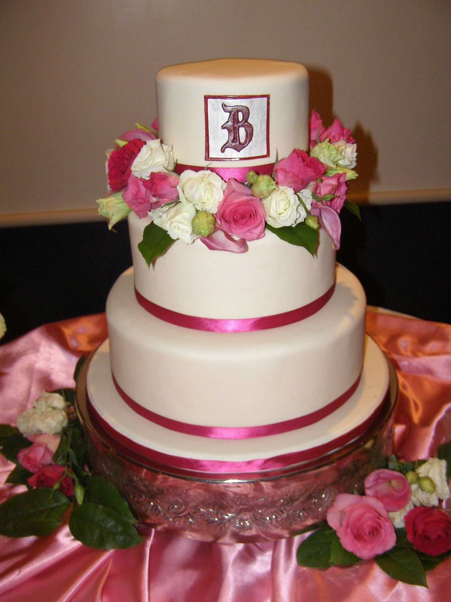 I made this cake for my sister's wedding this past weekend. I thought it turned out beautifully. They were real flowers.