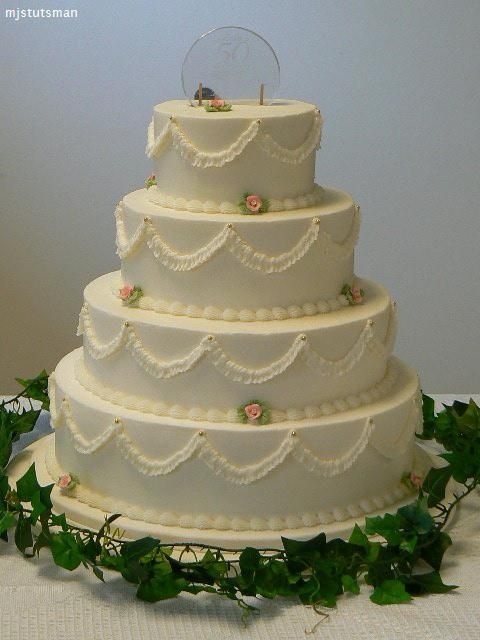 6', 9', 12" and 15" yellow cakes layers filled and iced with buttercream. Very fun cake! Tried my best to duplicate the original wedding cake (shown in photo) for a 50th wedding anniversary. Gold edible pearls and gumpaste rosebuds. They were very pleased which was so gratifying on this project.
