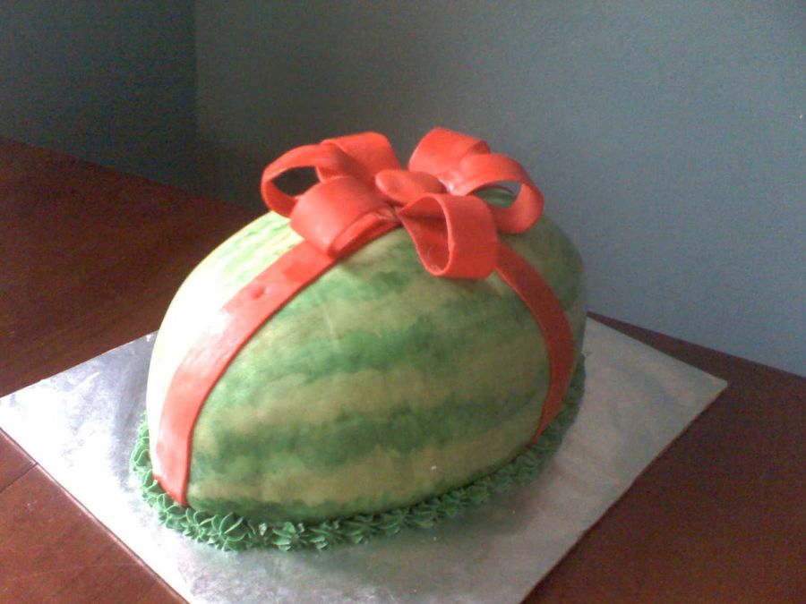 Used a football shaped pan, covered the cake in fondant and and handpainted the stripes with gel colors. I colored the vanilla cake pinky-red to resemble the inside of a watermelon.