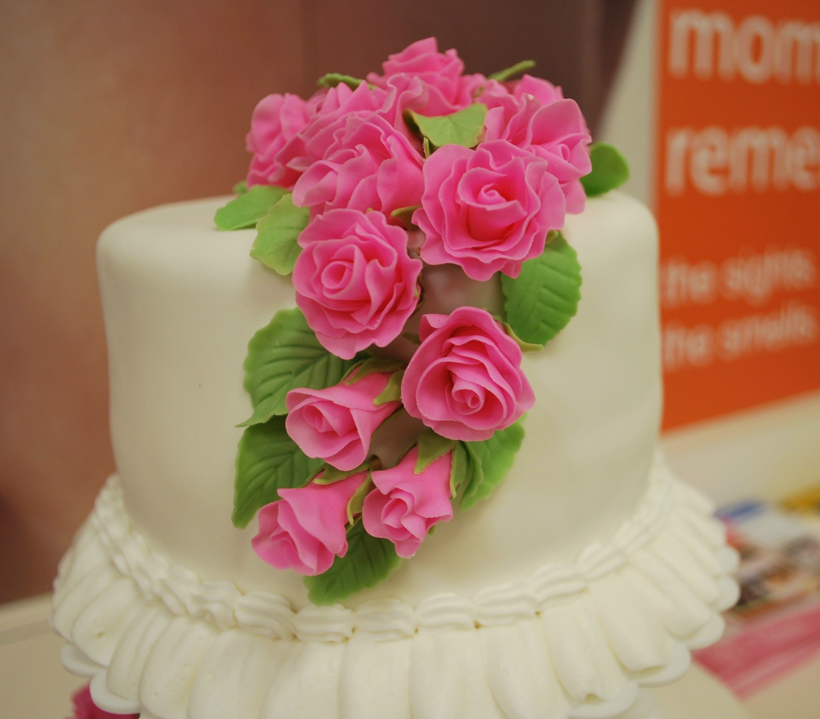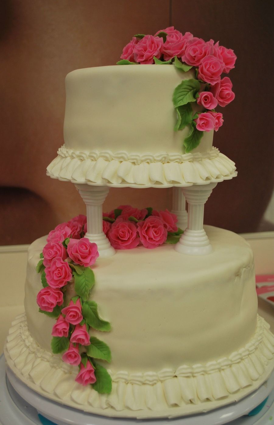 Final cake. Satin Ice fondant. BC accents. Hand made roses. Top tier was strawberry and the bottom was WASC.
