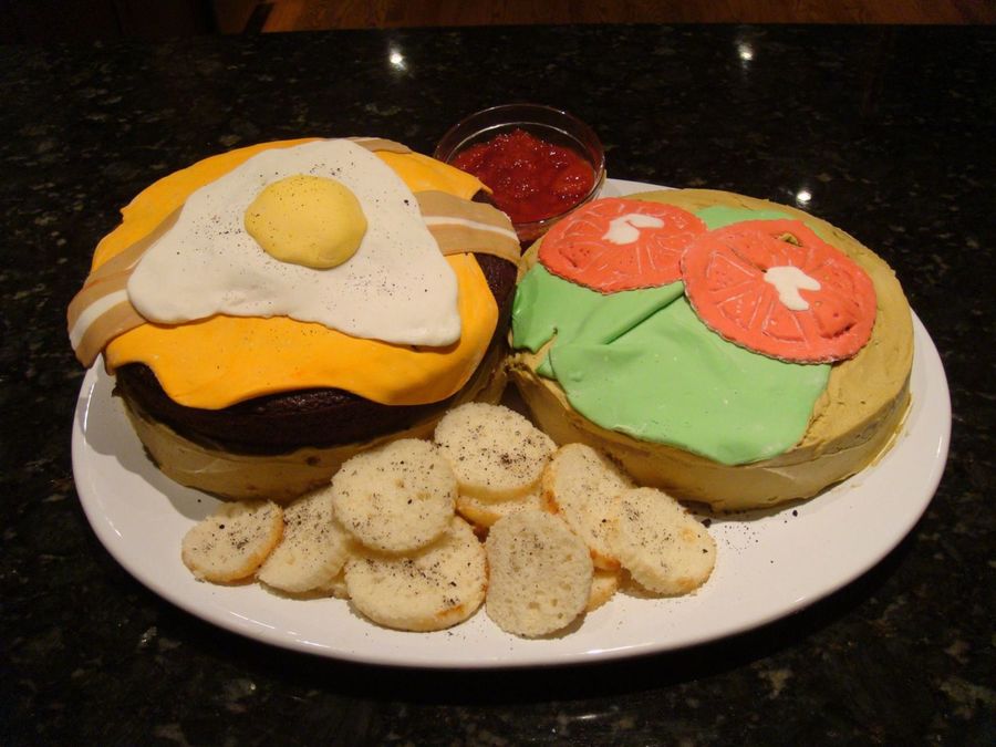 I made this cake for a co-worker. It is modeled after the Kuma Burger at Kuma's Corner in Chicago (his favorite!). All toppings are made of MMF. the chips are slices of WASC cupcakes. The ketchup is strawberry filling and the pepper on the chips and egg is crushed oreo. Enjoy.
