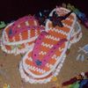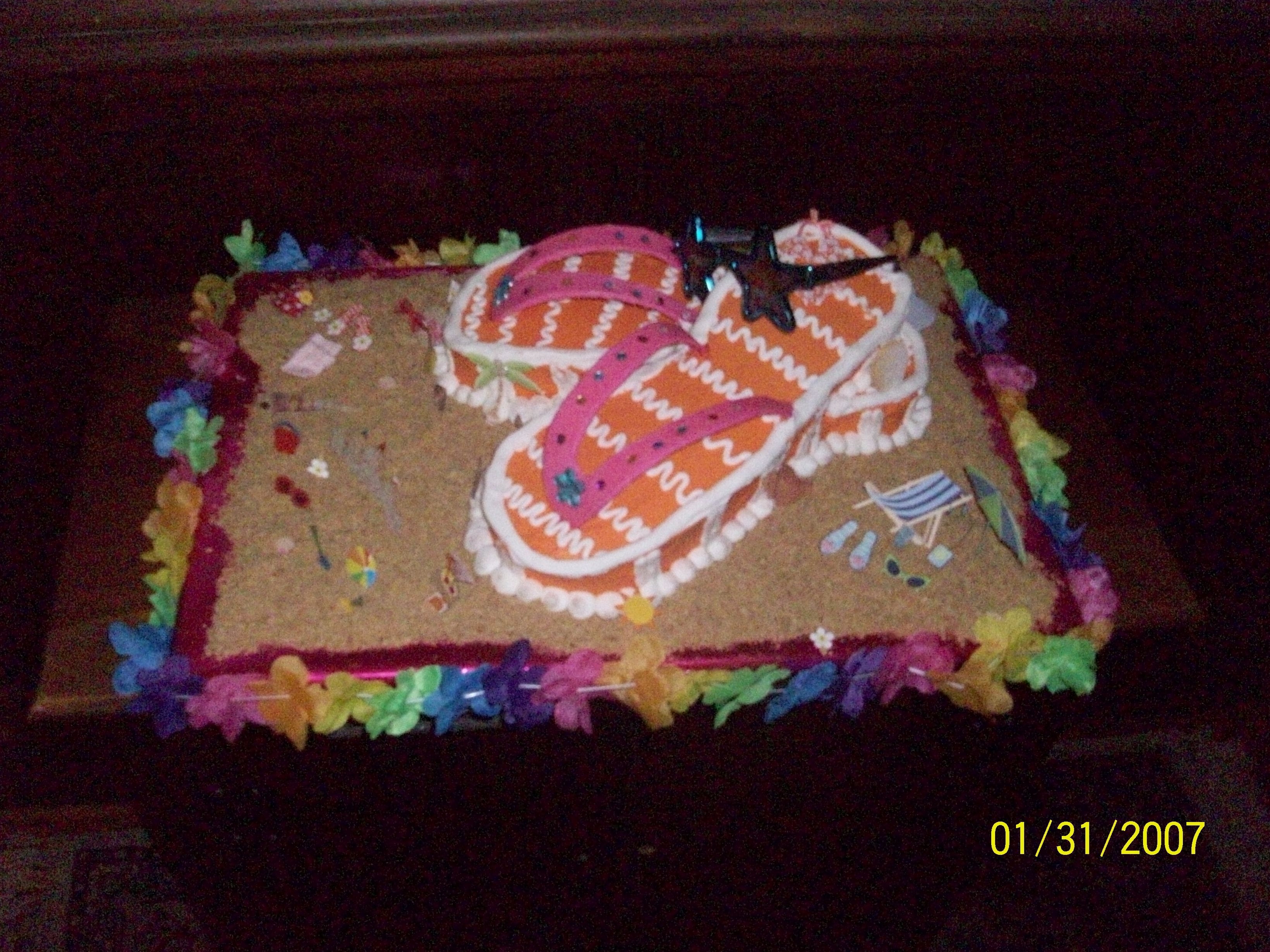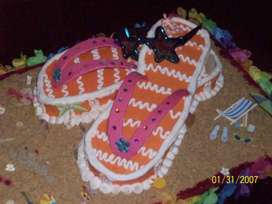 Flip Flop cake covered in BC. Gumpaste thong part with rhinestone details. Graham cracker crumb "sand" and scrapbooking stickers for little details. very fun!