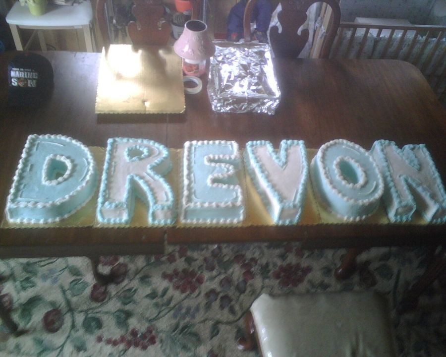This cake was 3 diferent flavors chocolate, strawberry and vanilla, all buttercream, carved letters to spell drevon.