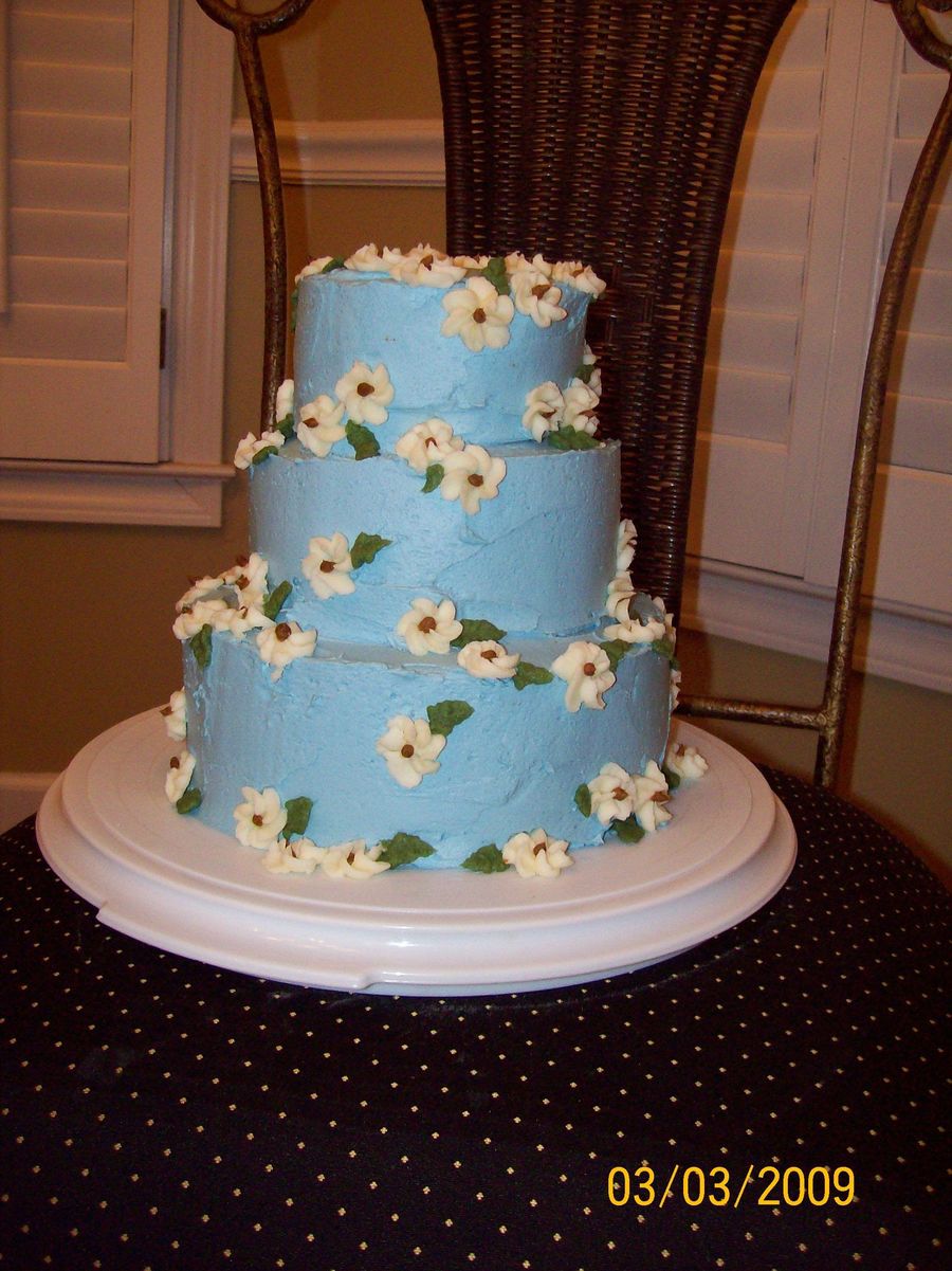 8 inch, 6 inch, and 4 inch cakes stacked with blue buttercream with white flowers.