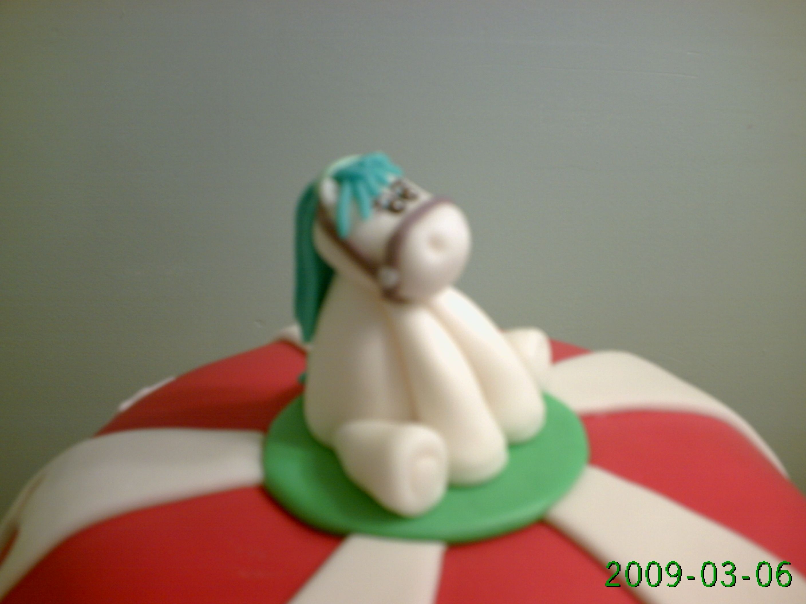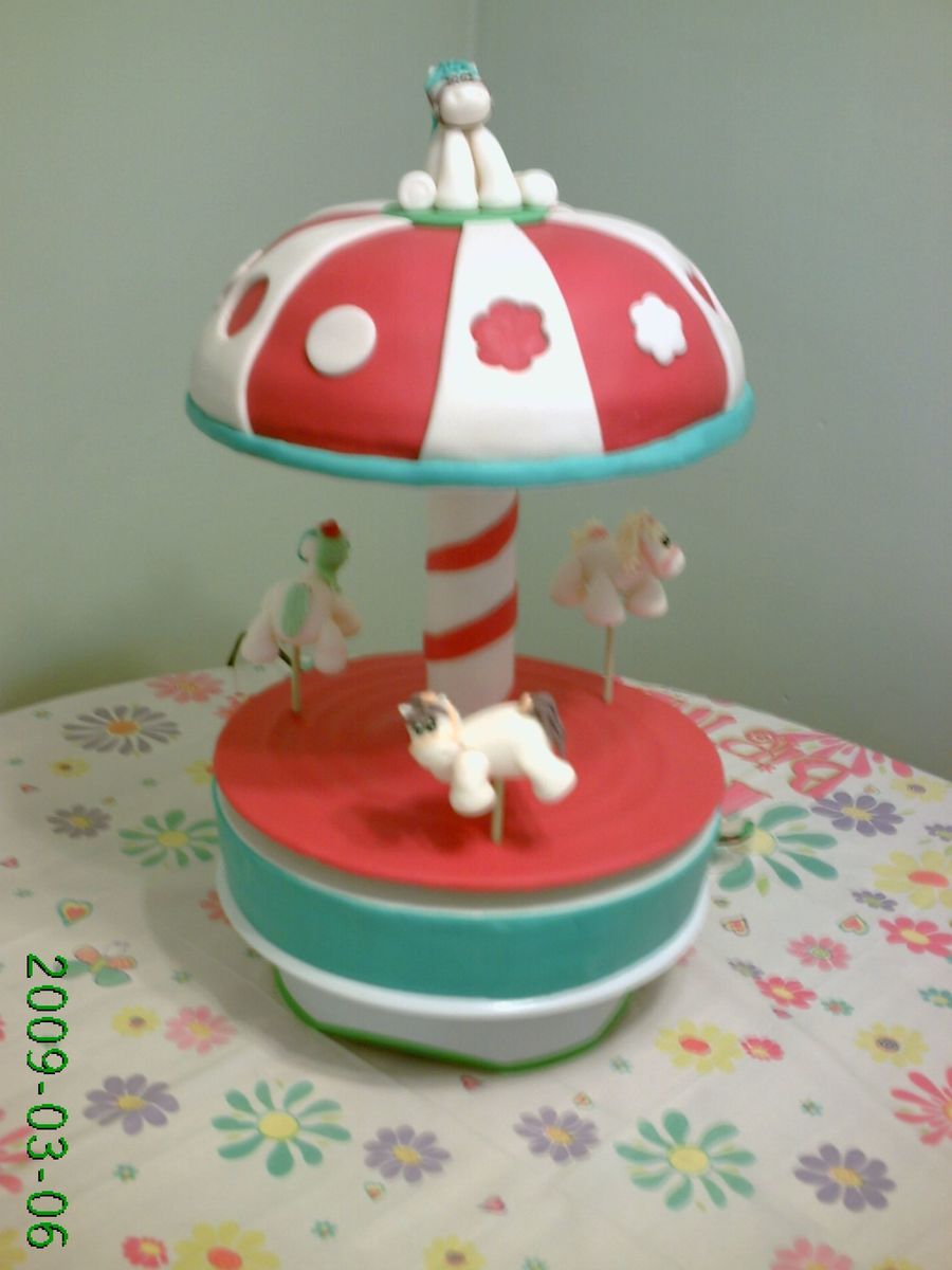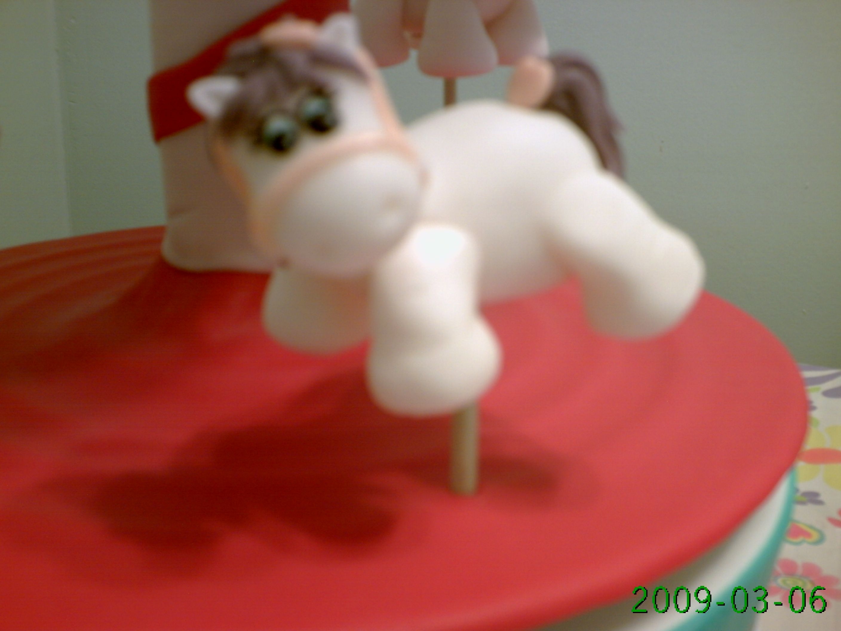 Carousel with horses that spin. Three horses that are in differents levels and one sitting on the top. The cake is the top part.