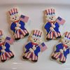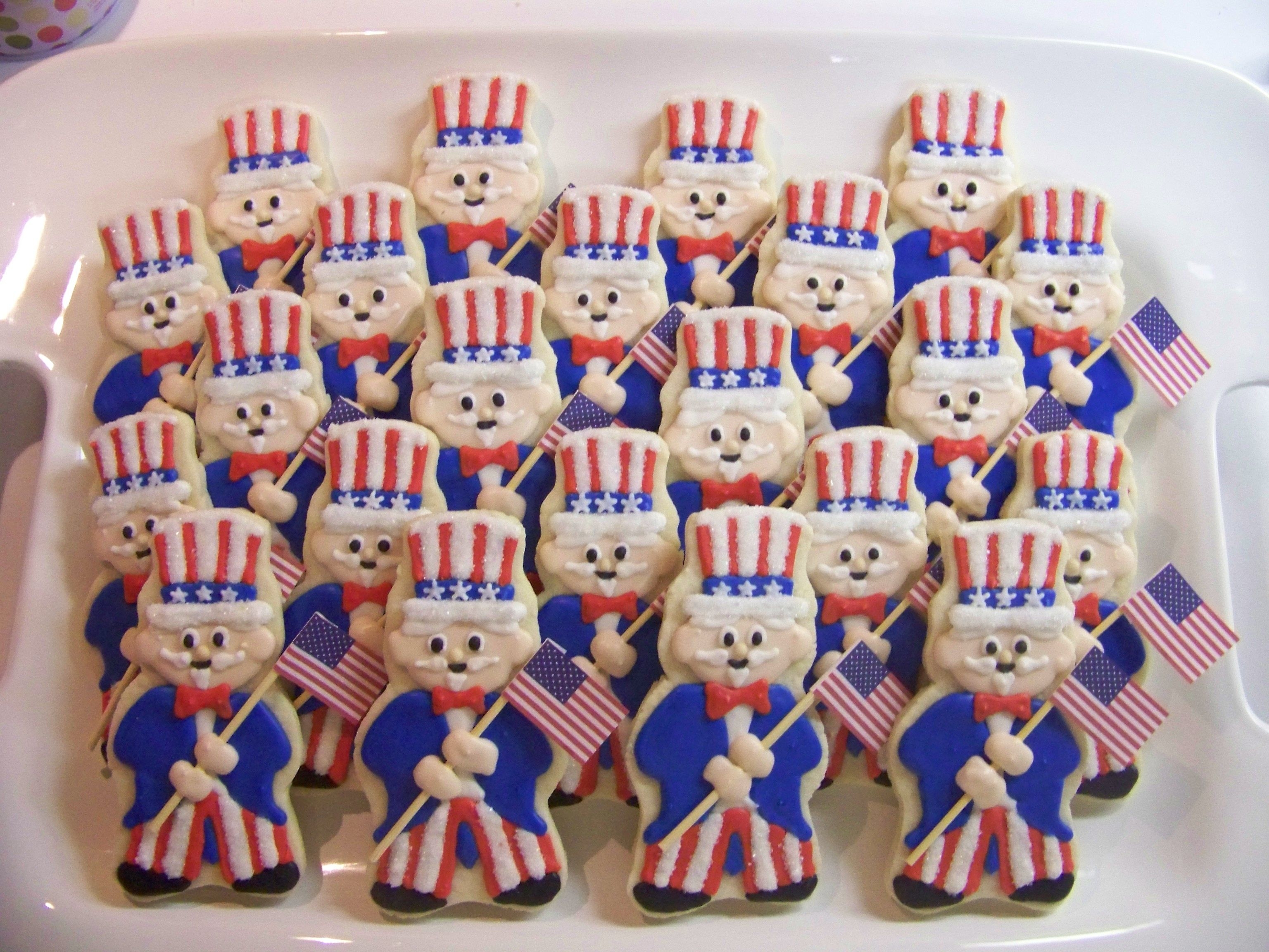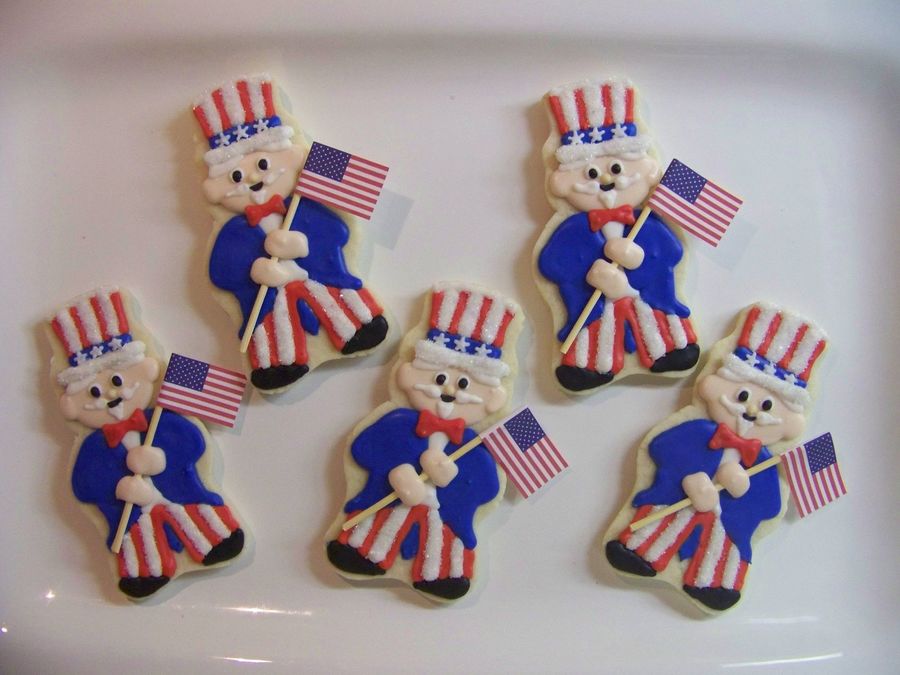 Patriotic cookies I made for my daughter's daycare class. Inspired by Wilton.com cake design. I made the flags as well using cut down bamboo skewers and they are attached to cookie with his royal icing hands.