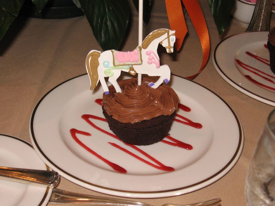 Make individually cut out horses from pastillage (a sugar paste that dries rock hard) and attached them to lollipop sticks and decorated them with royal icing. Then they went into oversized chocolate cupcakes.