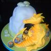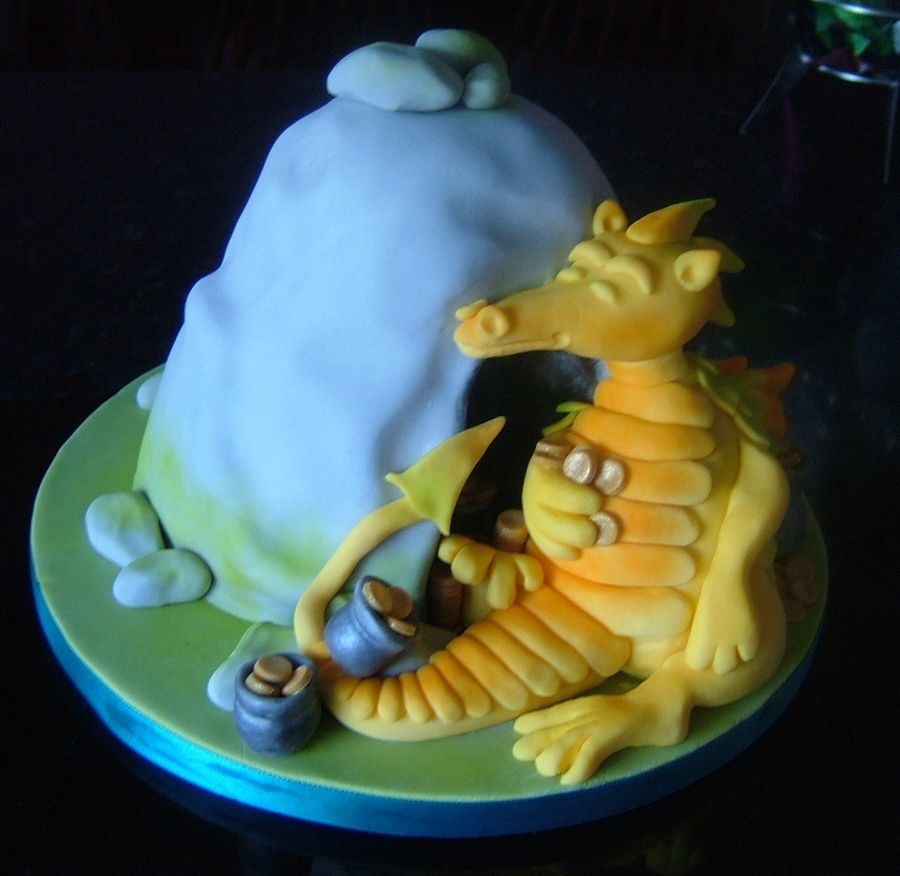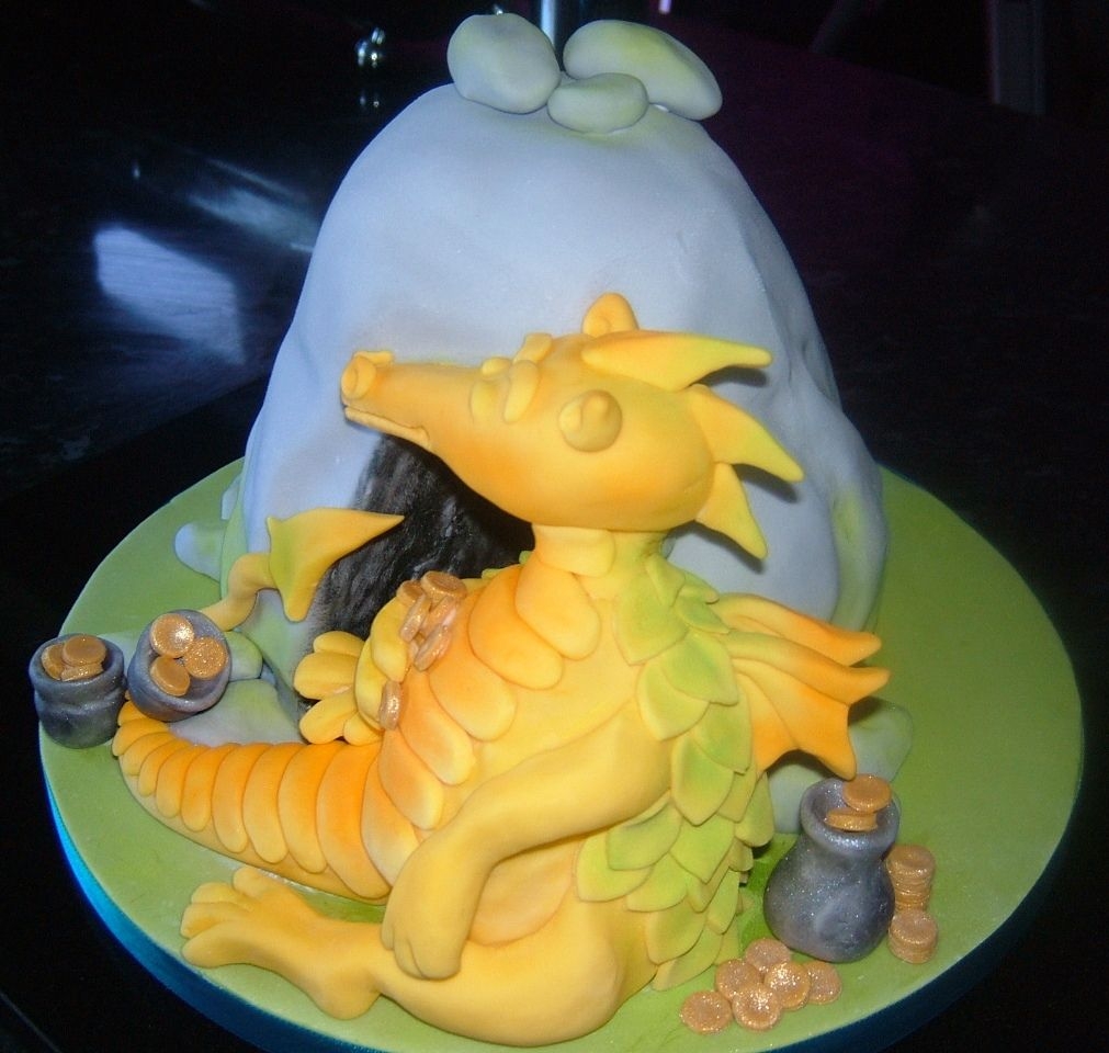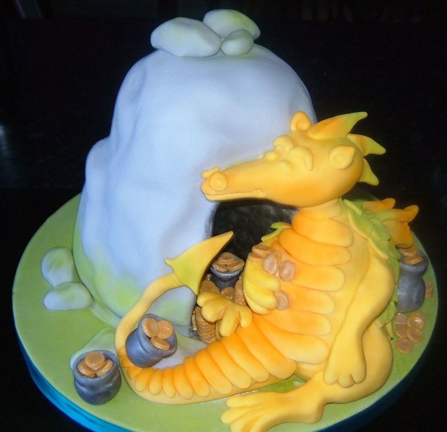 I made this for my friend's son who insisted on a dragon for his 6th birthday. The dragon's body is made from the piece of cake cut out to form the cave. The rest of him is made from sugarpaste dusted with petal powders. The coins and money pots are also from sugarpaste dusted in lustre powders.