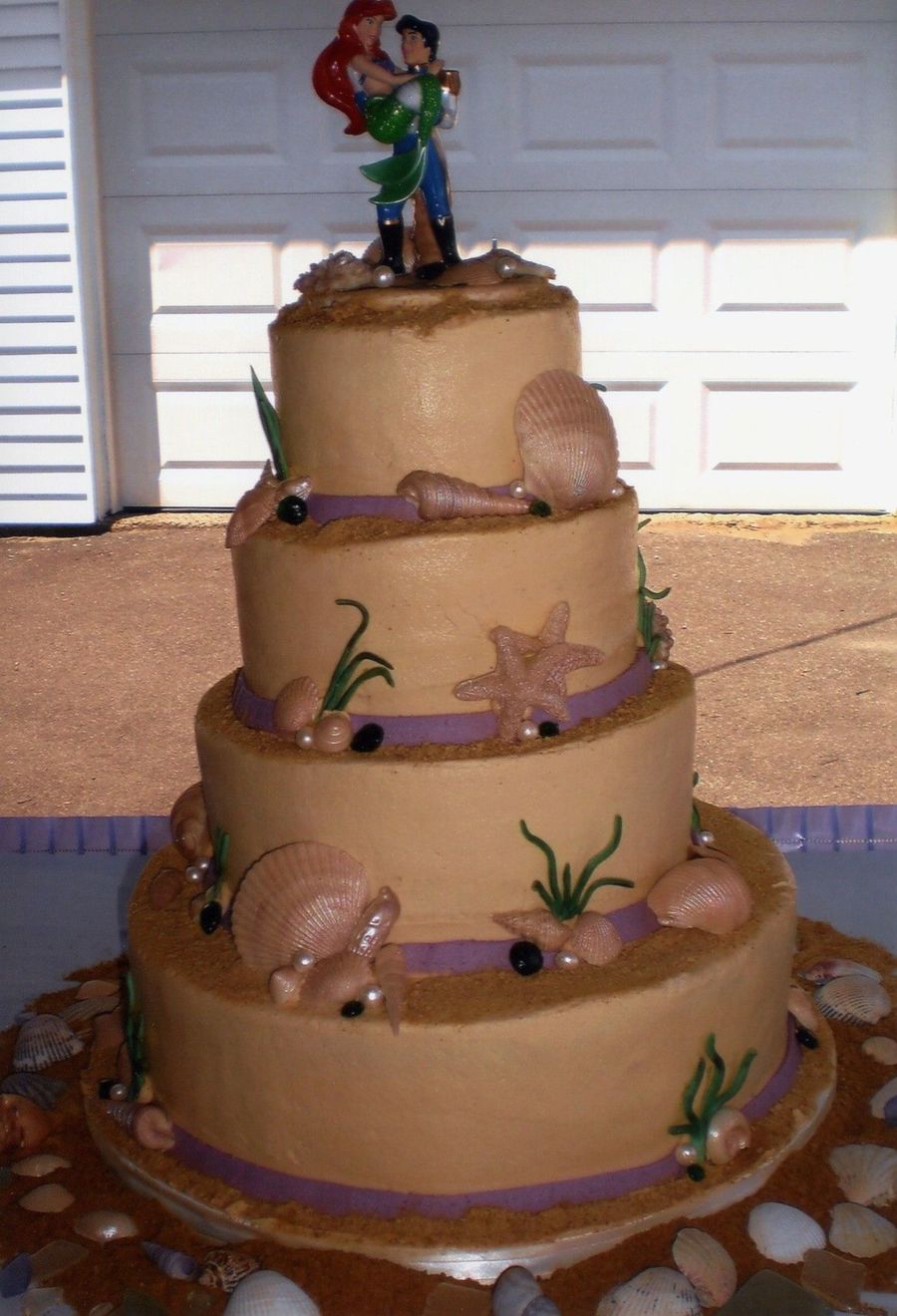 the cake is covered with buttercream the shells are done with candy clay and gram cracker sand. there were sugar gems that unfortunately photographed black, but were really a lovey green color. The topper was provided by the bride.