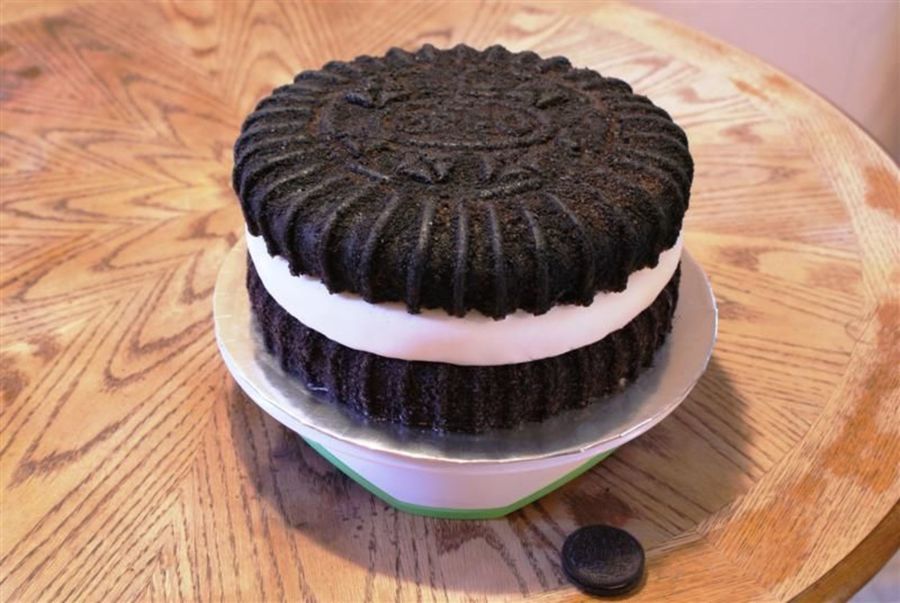 3 layered cake. Top and bottom layers are chocolate and the middle layer is white. They are iced with MMF individually and then crushed oreos pressed onto the top and bottom layer. It was difficult but I am proud of the result.