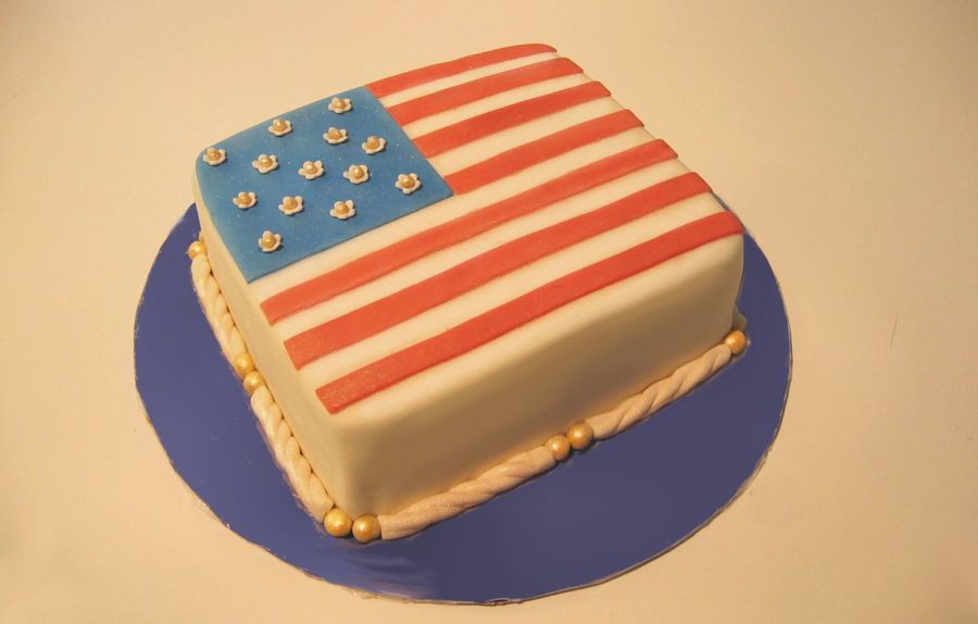 Fondant with fondant accents. My interpretation of the first official American flag. Two 8" squares stacked and trimmed to 8" x 6.5" rectangle.