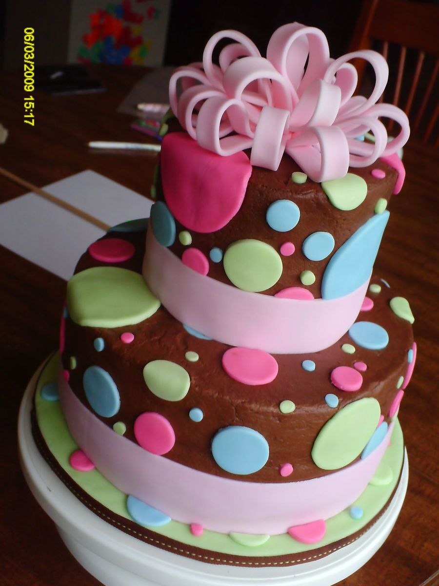 Chocolate cake, chocolate bc. Fondant dots and bow. Covered board in fondant and wrapped matching ribbon around it. This was a lot of fun. It got a lot of attention, too.
