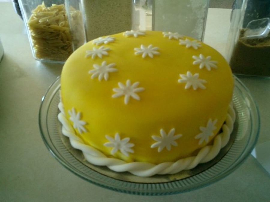 Airbrushed yellow fondant covered white vanilla cake .