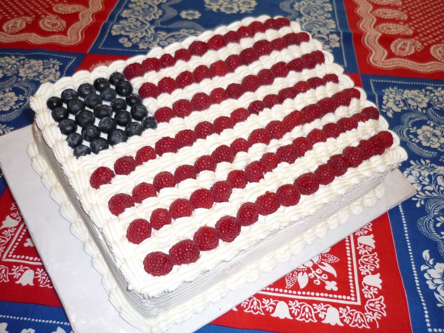 Red velvet cake with blueberries and raspberries on buttercream icing.