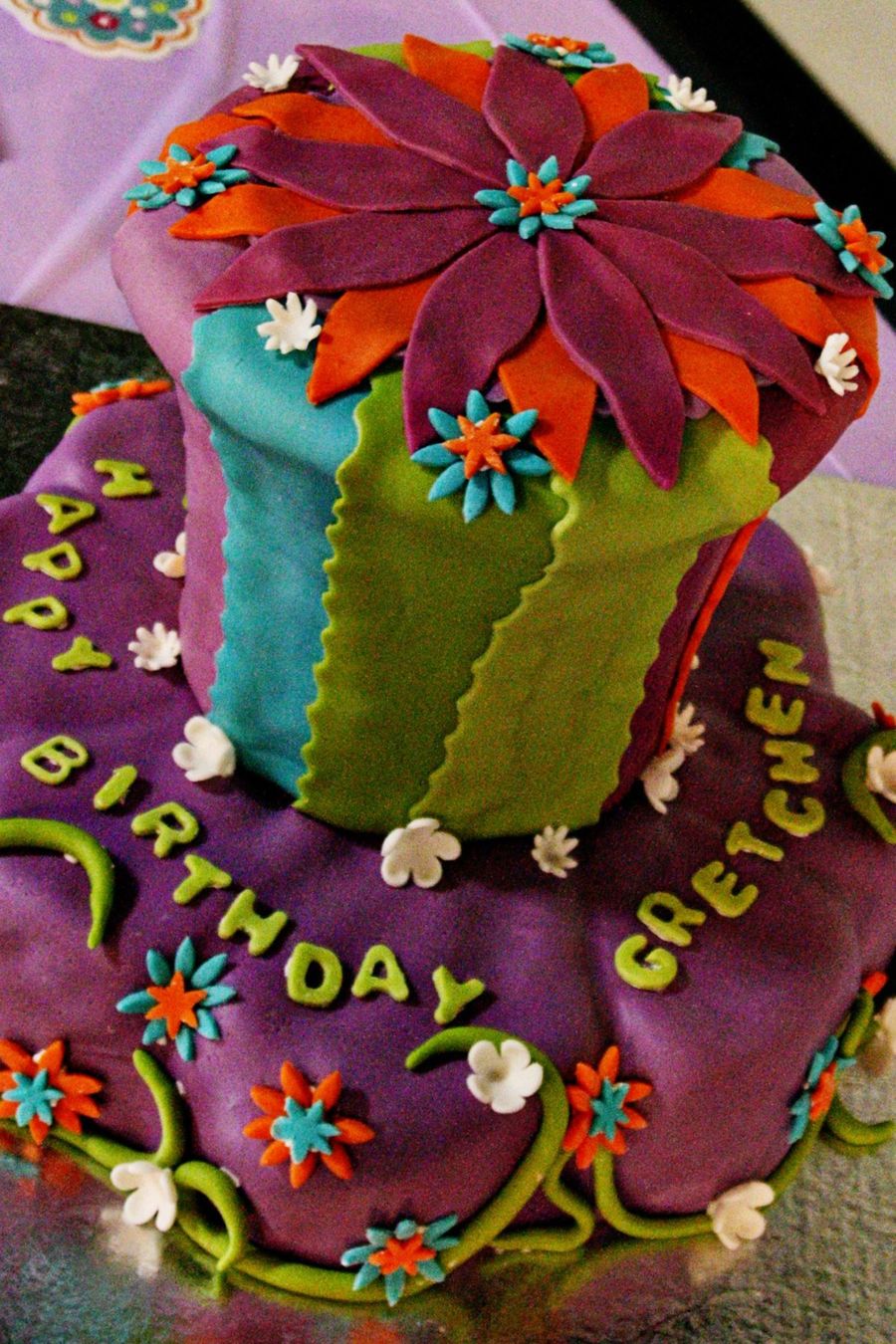 14" round cut to flower shape, 6"-8"? rounds carved to whimsical flower pot like shape. My daughter (5) wanted a flower party and this went well with the fun funky style of it! I even let my girls help cut and place the fondant flowers :) -they love to help!