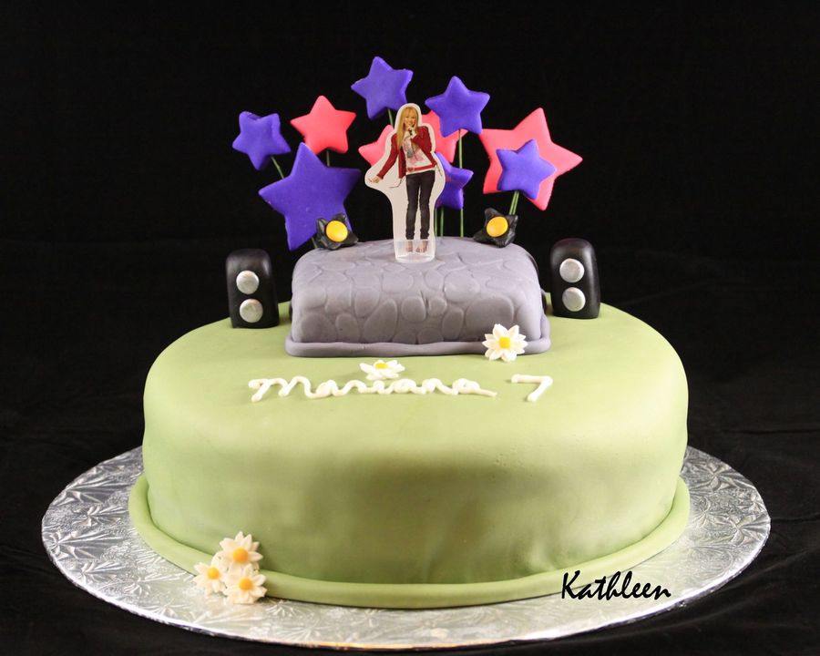This is for my daughter's 7th birthday. She wanted a Hannah Montana concert stage UNTIL she saw me making fondant daisies for another cake a week before here party. So we had to take the concert outside... 10" chocolate bottom, carved stage, everything is fondant except for Hannah who is from a game. I think my favorite are the speakers, they look so fun.