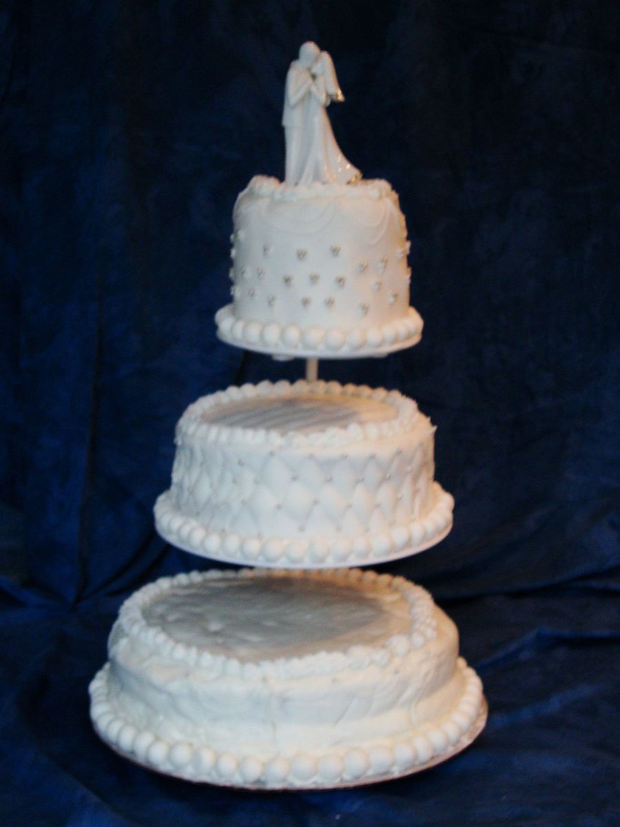 Bottom Tier- yellow cake, buttercream icing, marshmallow fondant, buttercream stingwork, silver ball sprinkles at connecters.