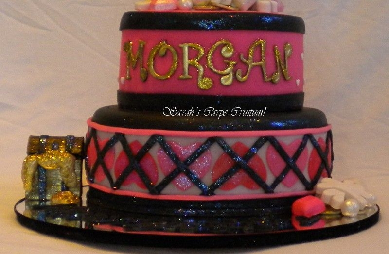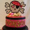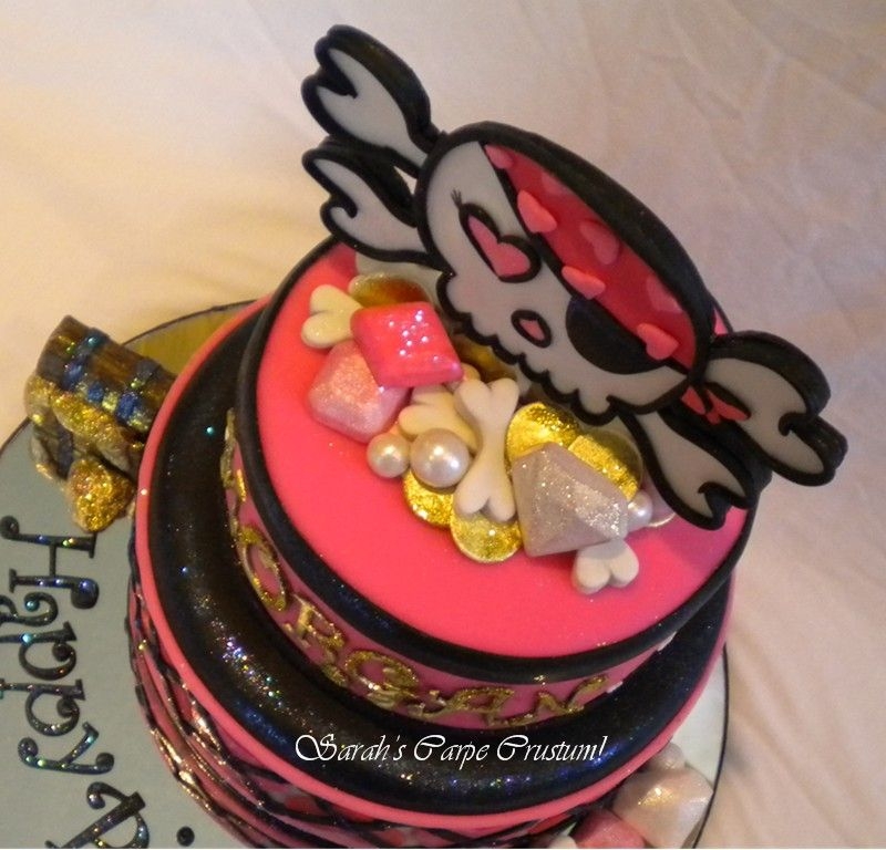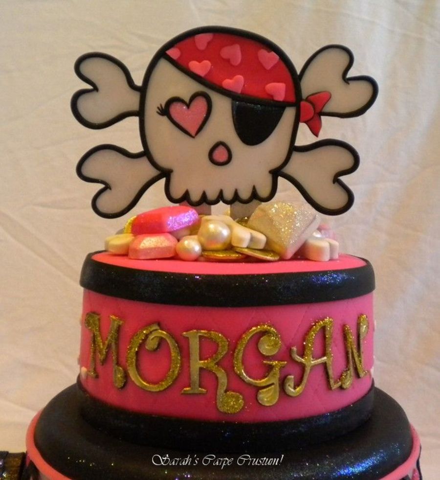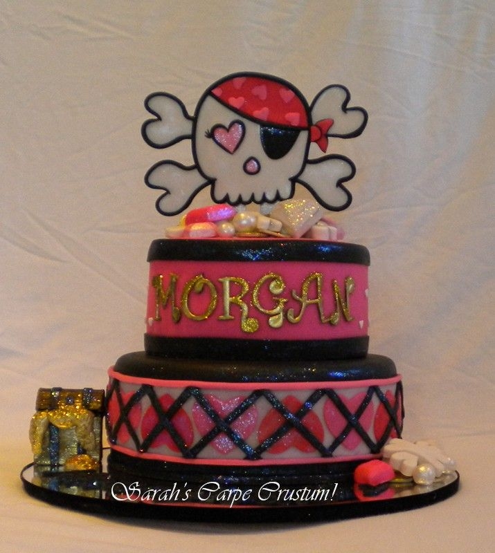 The topper is made from all gumpaste and luster dusts and disco dusts on popsicle sticks. That outlining was a real pain! The jewels and pearls and gold coins are also gumpaste. Heart Argyle. Funky letters-Love them!!! Made to match the Pink Pirate Birthday with some glittering gold for a glamour girl pirate.