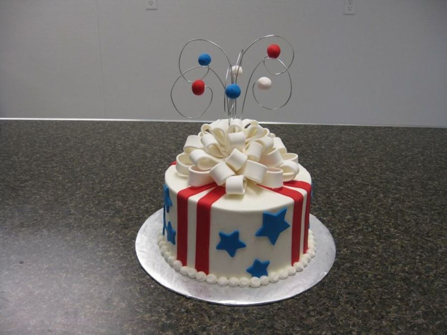Cake for a neighborhood block party. Strawberry cake with bavarian cream filling and vanilla BC. All decorations are ondant. Thanks for looking!