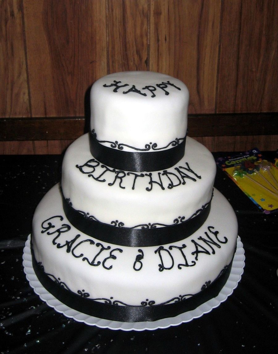 I made this for my cousin & her friend. Each tier is a different flavor cake and filling. It is covered in fondant. The piping is buttercream. I used real ribbon.