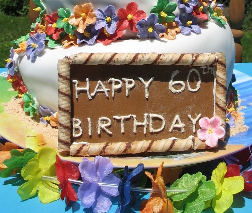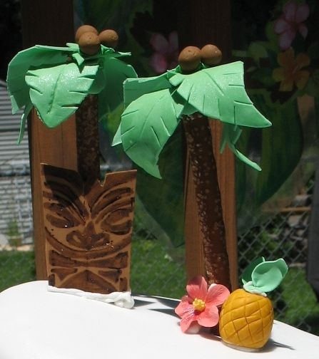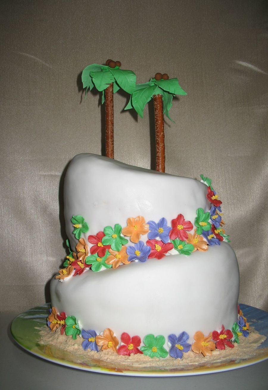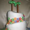 Lumpy fondant over a chocolate cake with mocha buttercream. Hibiscus flowers and palm leave are GP, trees are pretzels, sand is crushed Nilla Wafers. Other pics show details added at venue.