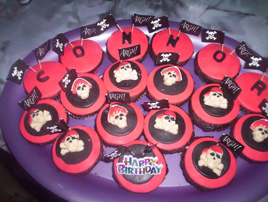 I made these to match my sons birthday cake. After i could not fit his name on the cake i went with these cup cakes and they turned out sooo good. they are chocolate fude cake with buttercream icing and toped of with fondant. I have used lollies on them and also tooth picks with pirate flags on them. I also used fondant to cut out the letters of his name.