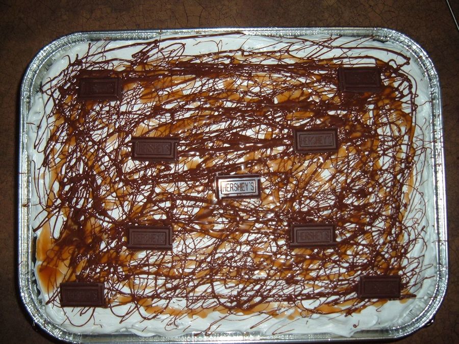 Scratch Chocolate cake(Hershey Deep Dark Choc) Caramel and Chocolate drizzle on Cool WHip/ Cream Cheese Icing