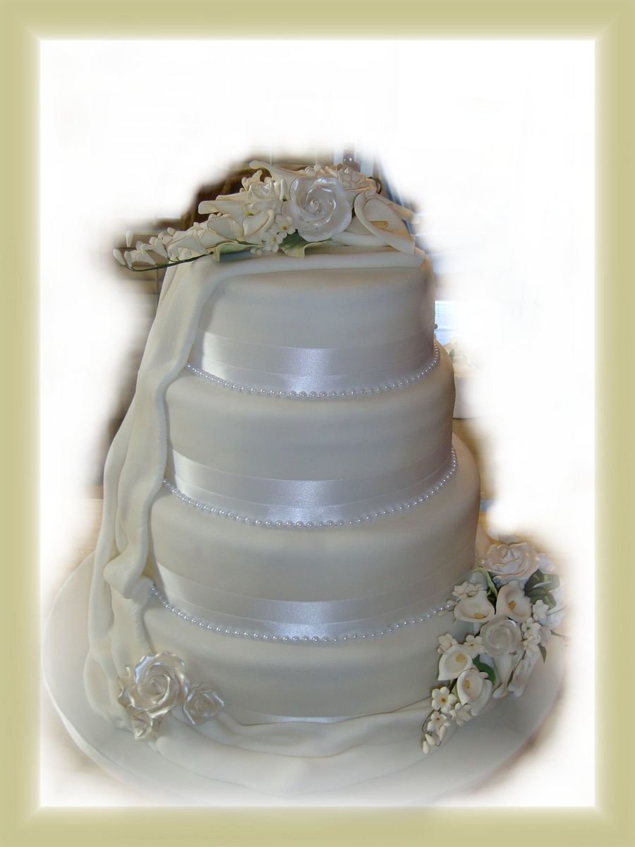 4 Tiers White Wedding with Cala & Roses. This entire cake is a chocolate bourbon; each layer with 3 rows of chocolate pastry cream filling. (I did the 'dummy' version of this cake a few months ago - this is the real one!). It is definately much easier to work with 'dummy' cakes versus the real thing.