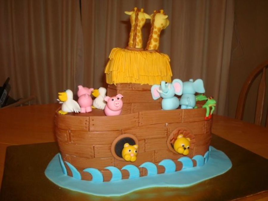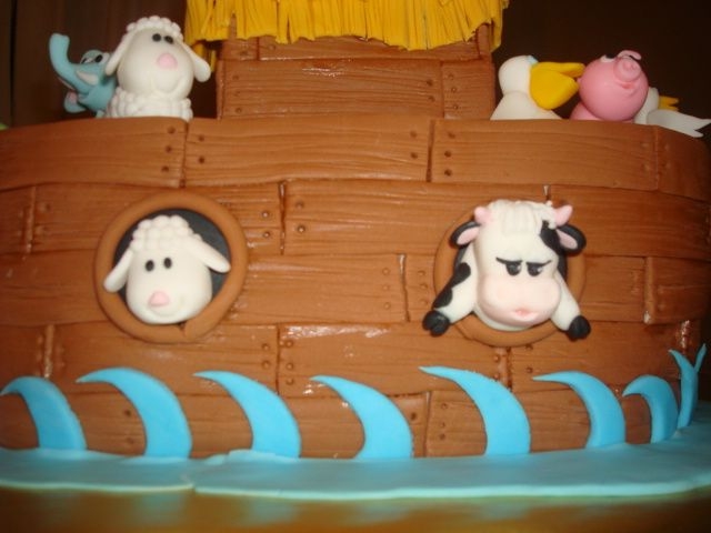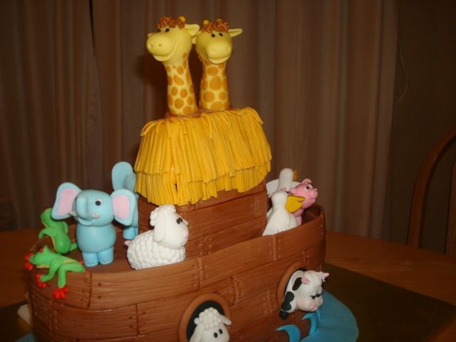 After seeing these cakes on Cake Central I have always wanted to try making one. So for my grandson's first birthday decided this would be the perfect opportunity since his name is Noah. White cake with buttercream icing and filling. Covered with fondant, all figures are fondant as well.