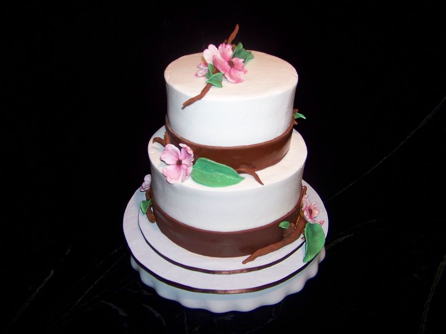 This was not actually for a wedding. But would have been great for one. 8" and 6" covered in buttercream with fondant ribbon and branches Gumpaste Dogwood flowers...