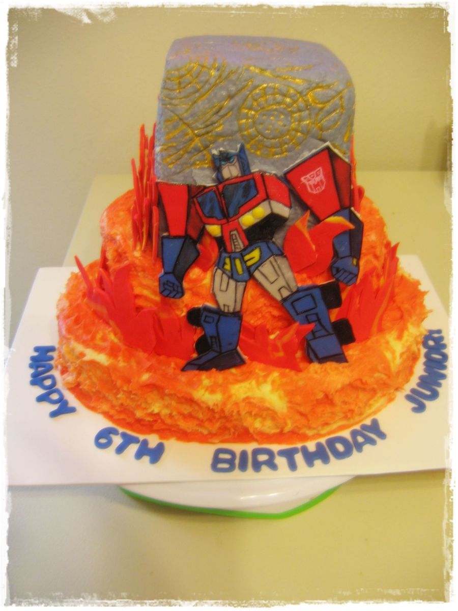 My nephew is a huge Transformer's fan and his absolute favorite is Optimus Prime. Funny, though...when he saw this cake his favorite part was all the flames! I think my husband liked the allspark best, but it was his idea so I guess he's biased! Chocolate cake with a peanut butter/chocolate chip cookie filling (that was probably too thick because it was difficult to cut, and iced with vanilla buttercream. I was too lazy to make my own fondant this time (I know...BAD!) so I used Wilton's red, blue and yellow premade fondant to make the flames and Optimus Prime. All the kids wanted to make sure they had a flame or part of O.P. to eat! They didn't complain about the taste, but six year olds don't really know any better. They just thought it was fun! TFL