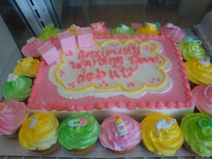 I love making baby shower cakes. Cake is white with fresh strawberries and cocholate and white cupcakes.